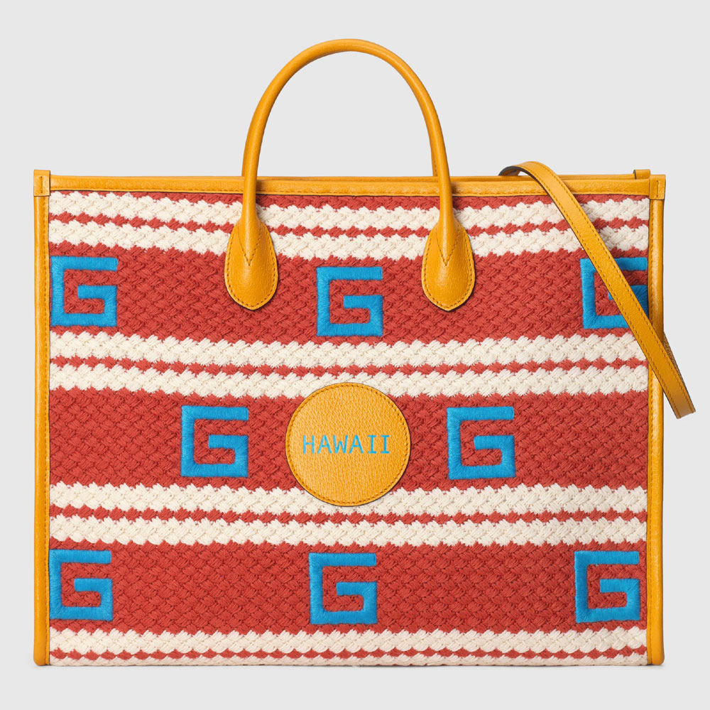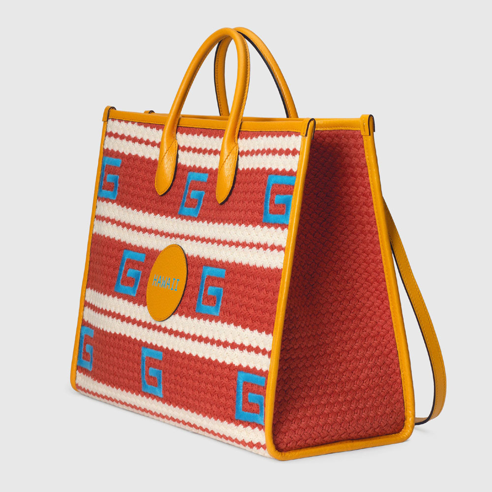 A special collection inspired by the vibrancy of world-renowned resort destinations presents a woven tote bag individualized with colors. trims and personalized leather tags representing each location. 'Hawaii' is embossed in metallic gold lettering on a leather patch enriching the tote. Stripes and embroidered Gs are juxtaposed with yellow leather trims.