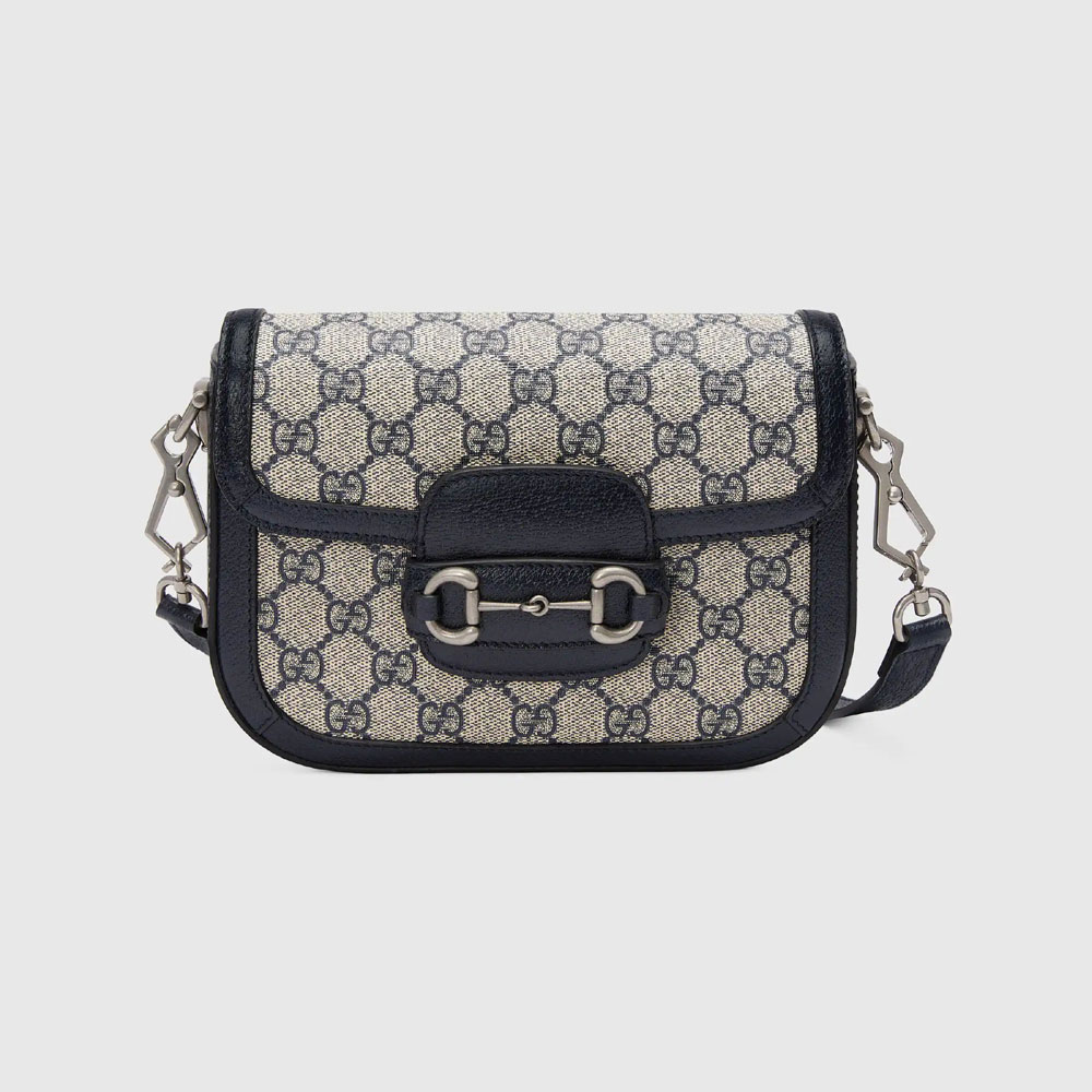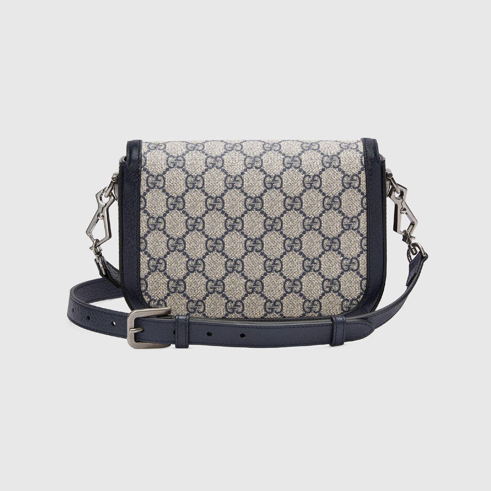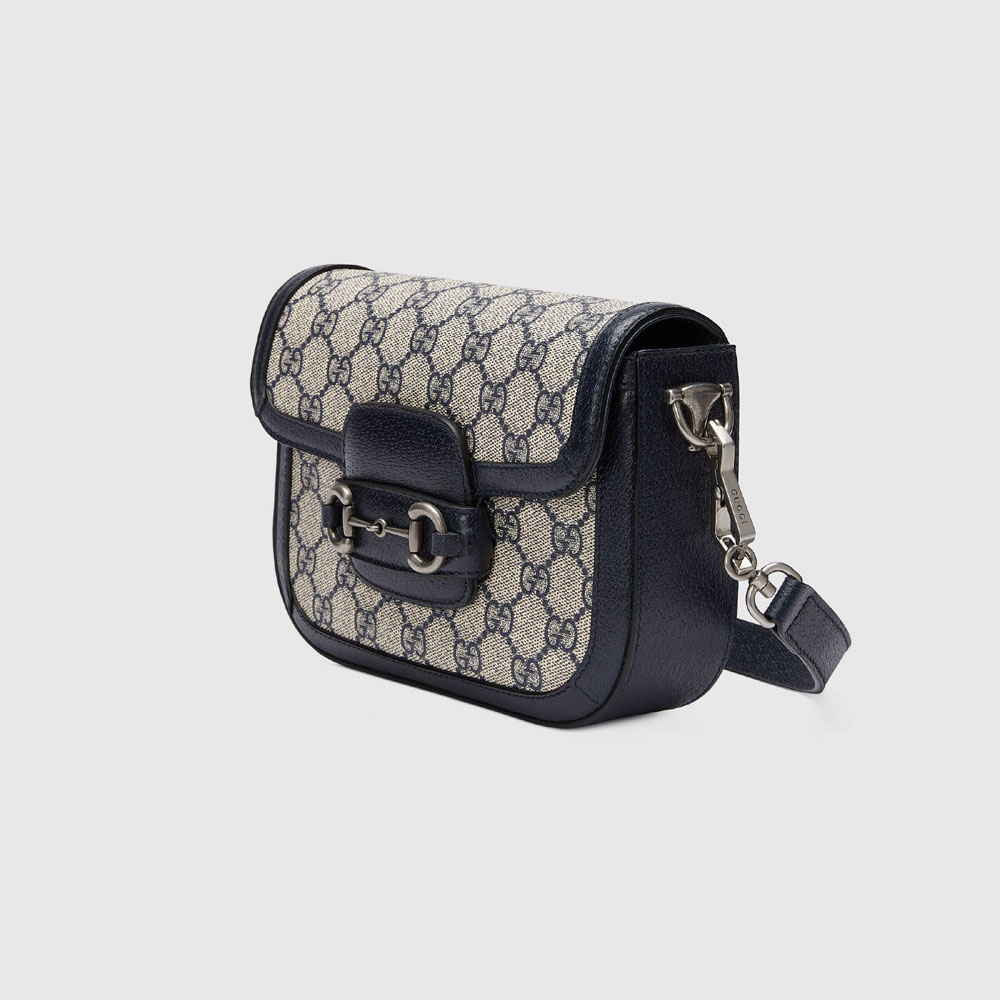 Mirroring the material's historic origins. GG Supreme is introduced in a timeless mix of blue and beige for Gucci Love Parade. With a low environmental impact. the canvas has come to the front of each collection decade after decade to become a hallmark of the House. Here. the classic palette defines this mini bag from the Gucci Horsebit 1955 line.