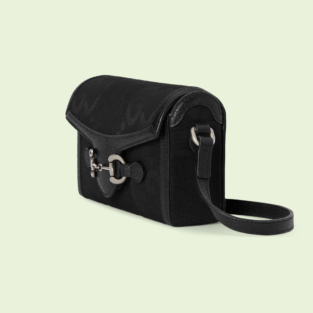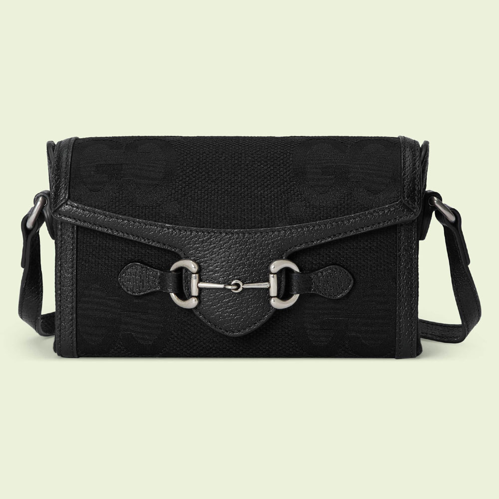 Signature small leather accessories from the jumbo GG line spotlight an all-black design for Spring Summer 2023. A reinterpretation of Guccio Gucci's initials. the GG features prominently in maxi size for a distinctive logo feel atop this Gucci Horsebit 1955 mini bag.