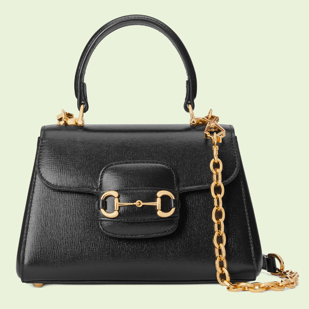The Gucci Horsebit 1955 is presented as a top handle bag in black leather. The collection unifies details first introduced on the original bag that inspired the line from over six decades ago with a modern spirit. highlighting the Horsebit. Part of Guccis genetic code. the double ring and bar design has been established as one of the most distinctive elements among the House symbols borrowed from the equestrian world.
