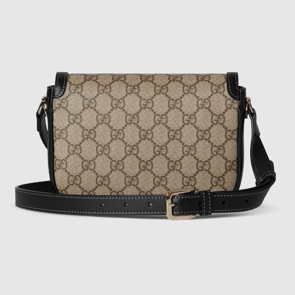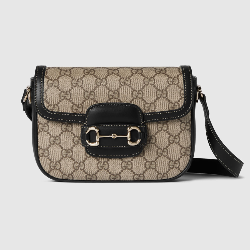 The Gucci Horsebit 1955 continues its equestrian-inspired design with the double ring and bar hardware, blending light gold-toned details and GG Monogram coated fabric, with a soft and sophisticated feel, on this mini shoulder bag.