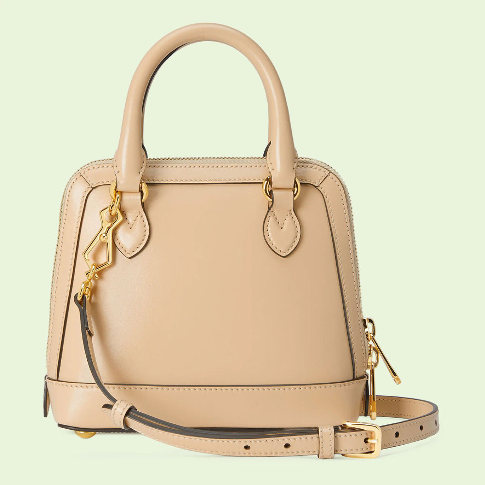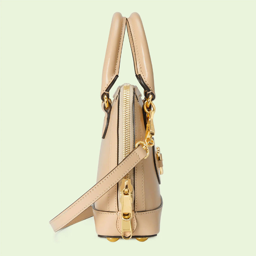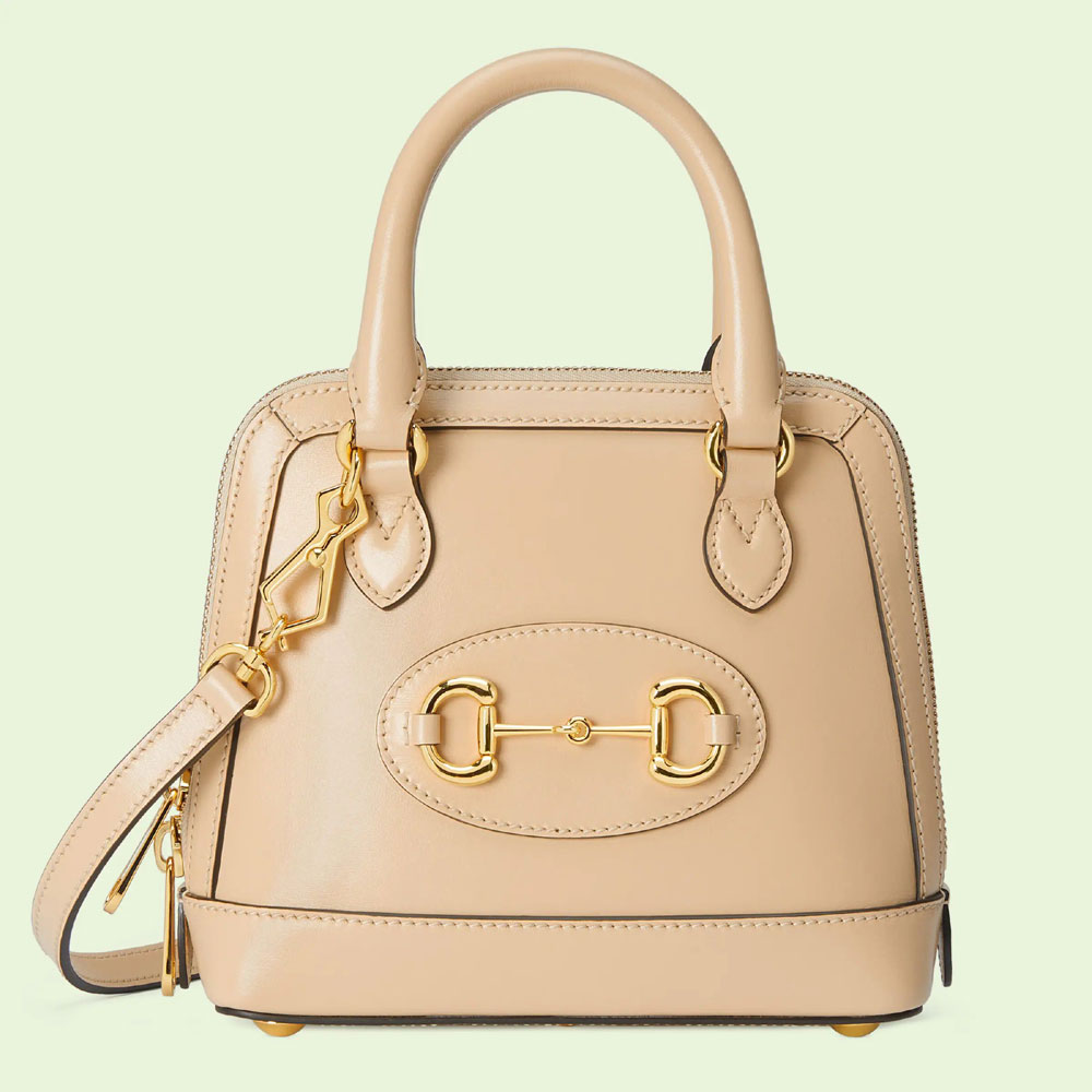 A miniature version of the Gucci Horsebit 1955 top handle bag is introduced for Ouverture in beige leather. The style's signature Horsebit hardware decorates the style. paying tribute to the House's equestrian heritage.