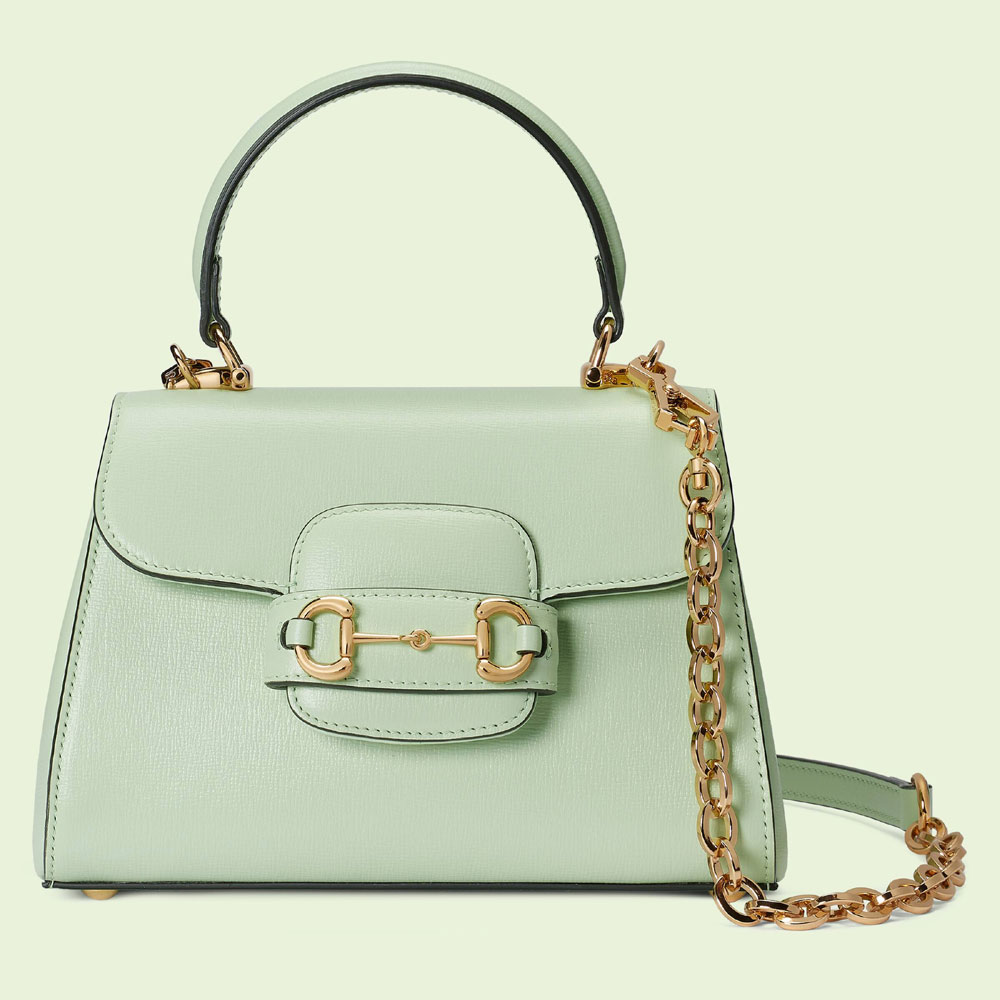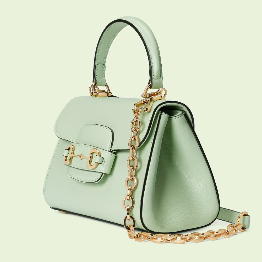 The Gucci Horsebit 1955 is presented as a top handle bag in light green leather. The collection unifies details first introduced on the original bag that inspired the line from over six decades ago with a modern spirit. highlighting the Horsebit. Part of Guccis genetic code. the double ring and bar design has been established as one of the most distinctive elements among the House symbols borrowed from the equestrian world.
