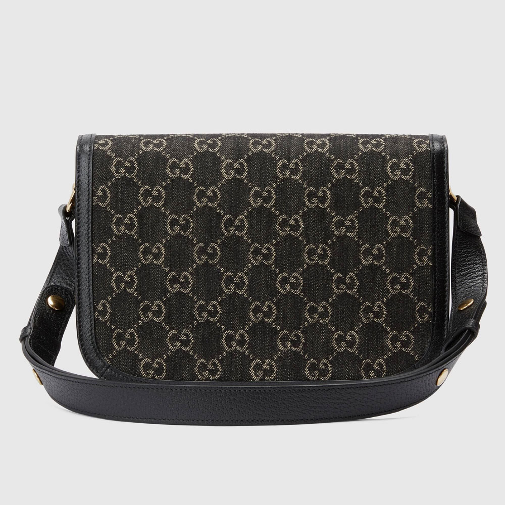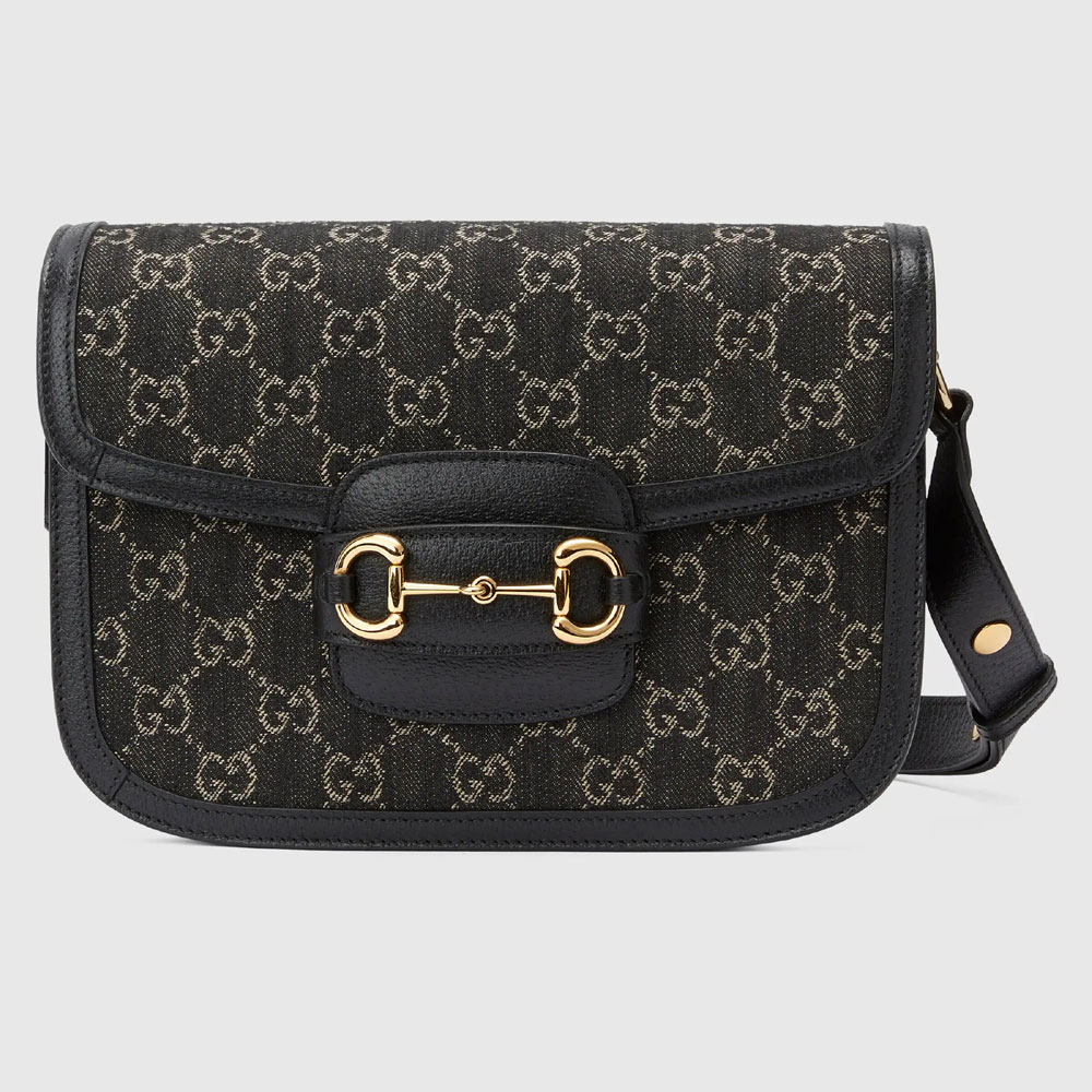 A historic design. the Gucci Horsebit 1955 shoulder bag is reimagined in denim. A message about leaving fashions old rules behind. the House's designs convey the idea that pieces should be timeless-not just in fashion for one season. Speaking to this theme. the emblematic style is linked to the Gucci's rich history by the recognizable Horsebit hardware and monogram motif.