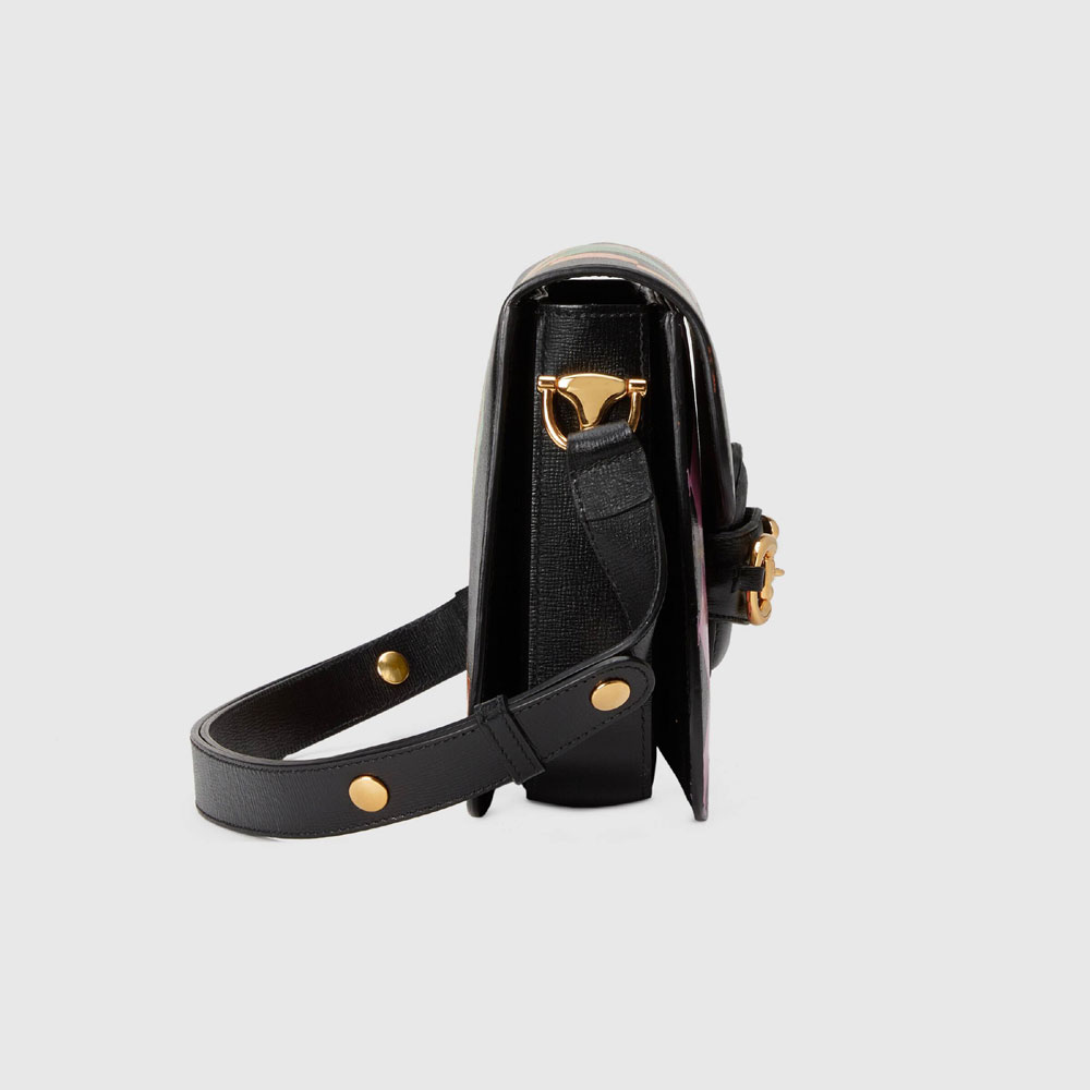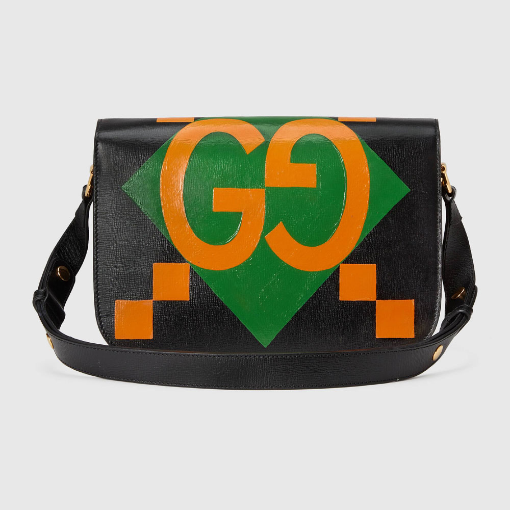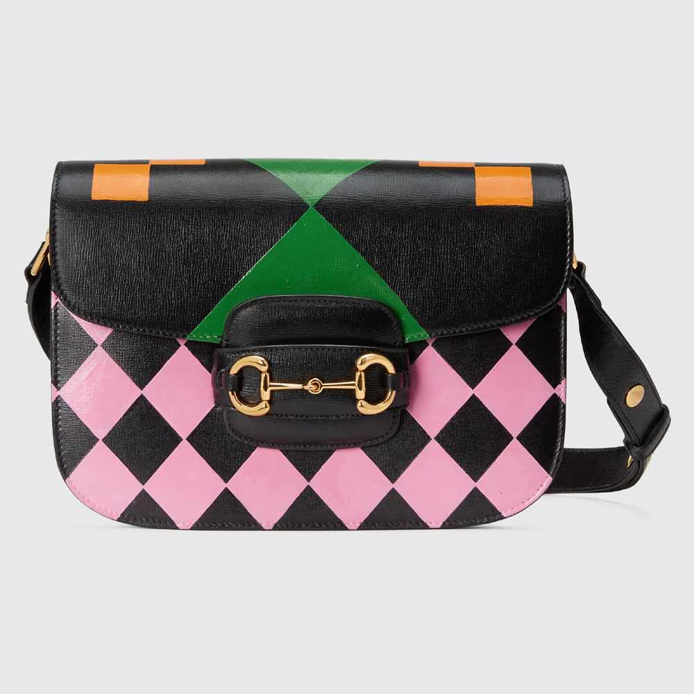 This item features bright and colorful geometric motifs that recall the uniforms worn by horse riding jockeys. The collection is inspired by the Parade Ring. or paddock. where horses walk around as a warm-up before the race and to help racegoers pick a winner. Here the print appears on this Gucci Horsebit 1955 shoulder bag.