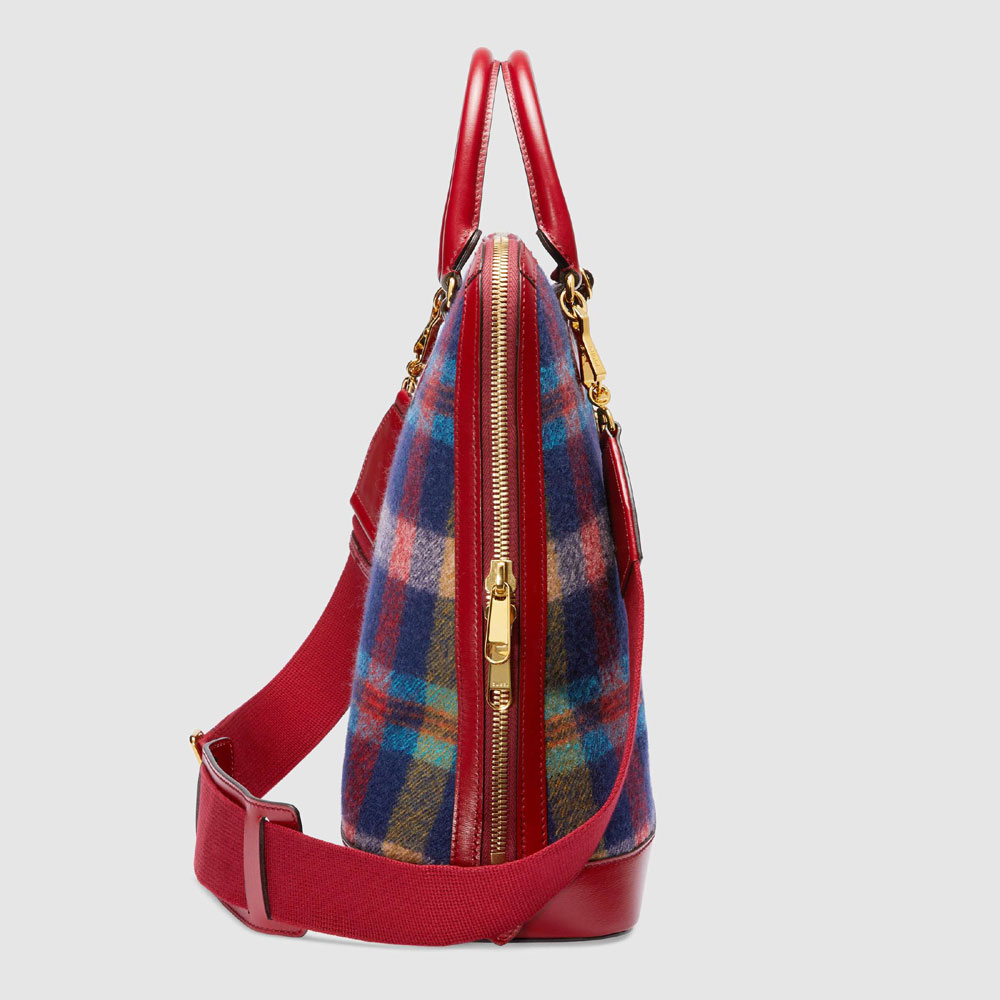 The distinctive shape of the Gucci Horsebit 1955 duffle bag is introduced in a blue check wool fabric for Fall Winter 2020. Trimmed with red leather in a domed shape. The top handle bag is completed with an optional nylon shoulder strap. The collection unifies details first introduced on the original bag that inspired the line from over six decades ago with a modern spirit. Highlighting the Horsebit. Part of Guccis genetic code. The double ring and bar design has been established as one of the most distinctive elements among the House symbols borrowed from the equestrian world.Pieces with versatile ways to wear and style embrace each person who is part of the Houses individual spirit.