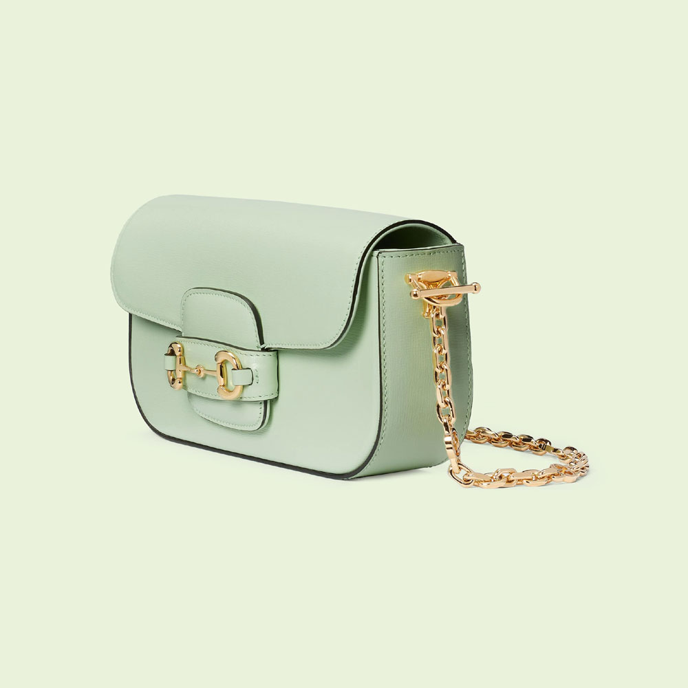 Much like the shades of green. Gucci's enduring designs continue to present fresh iterations season after season. For Spring Summer 2023. sage green enriches the latest leather goods selection with a burgeoning spirit that stands the test of time. Here it illuminates the Gucci Horsebit 1955 small shoulder bag. complete with gold-toned details.