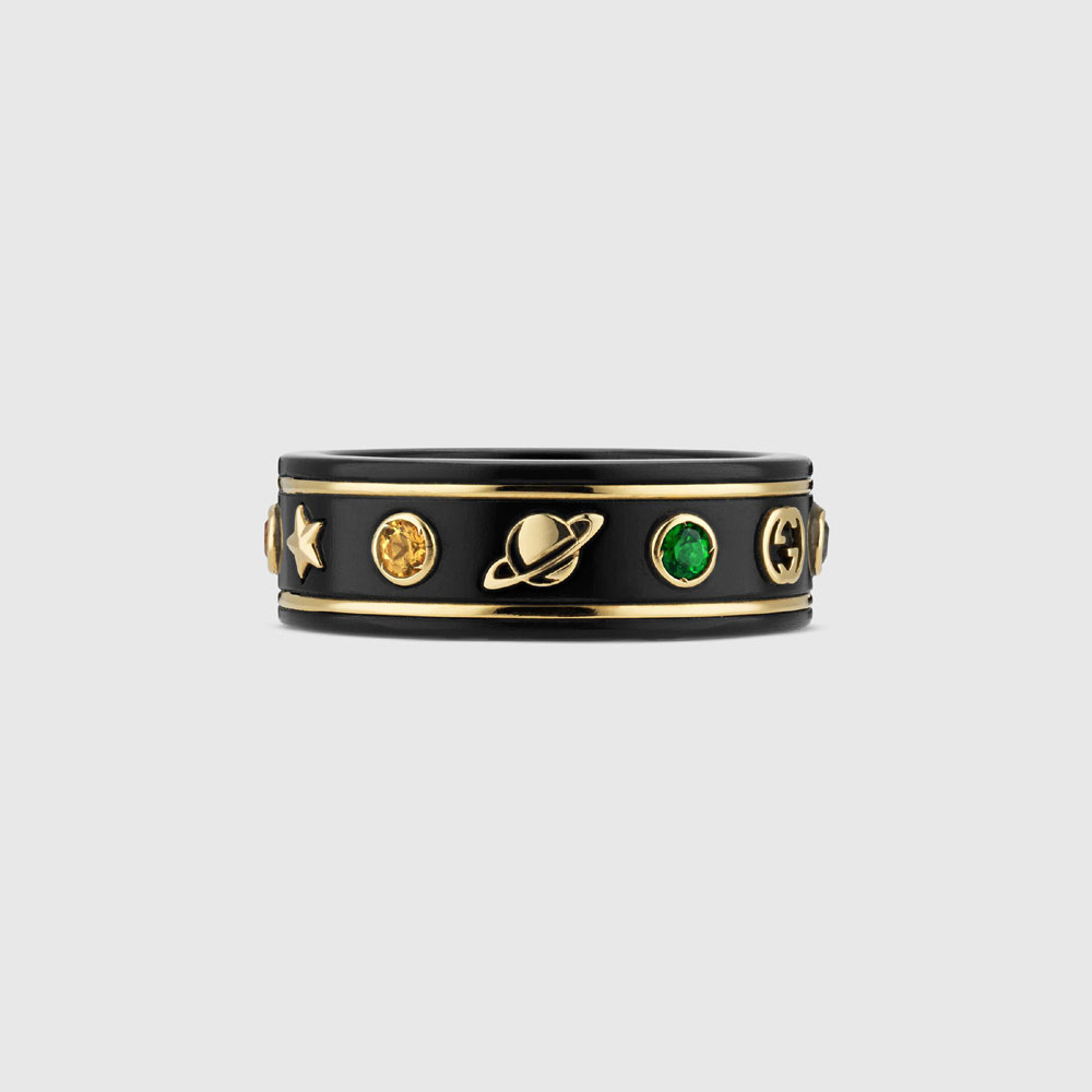 Delving into the House's eclectic narrative. the Icon collection evolves with the introduction of motifs that have become distinctive of the Gucci world. Crafted in 18k yellow gold. the planet. the bee. the star and the Interlocking G are set against a black band and alternate with multicolor gemstones.