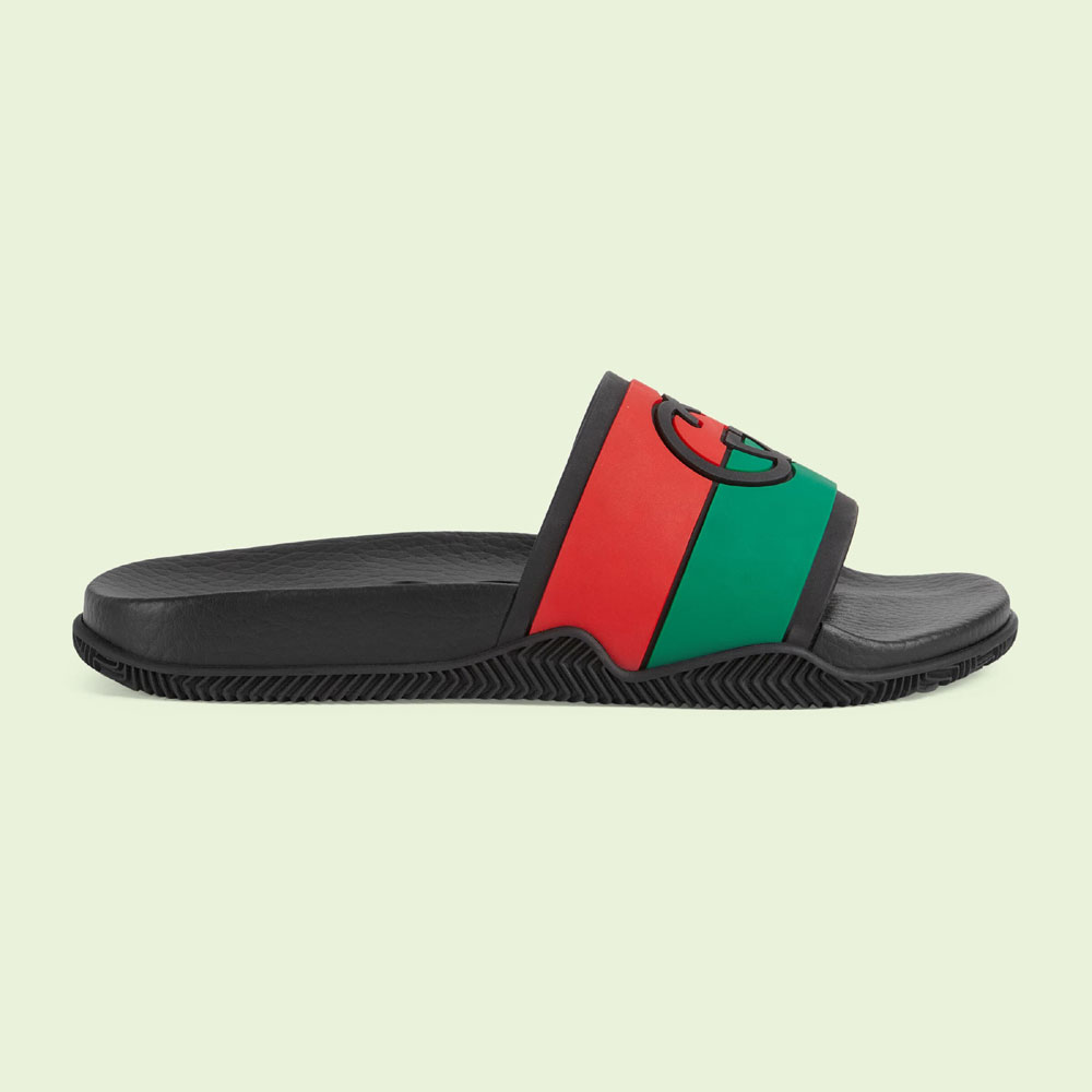 House codes define this rubber slide sandal. Paying tribute to two symbols of from the archives. the Interlocking G. a reference to Guccio Gucci's monogram. mixes with red and green stripesa reference to the House Web.