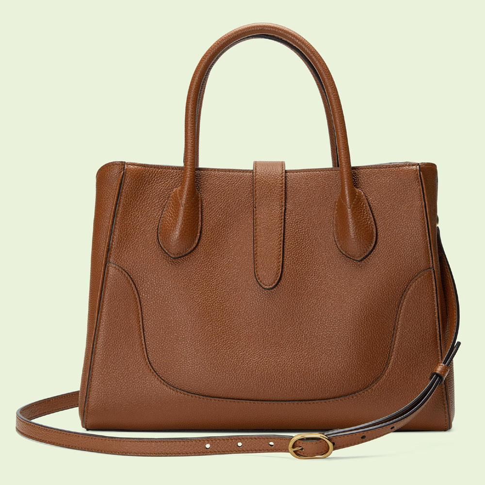 The world of Jackie 1961 is enriched with a small tote bag finished with a detachable shoulder strap. Presented in natural grain leather in a classic brown hue. the small sized style is defined by the emblematic piston closure.
