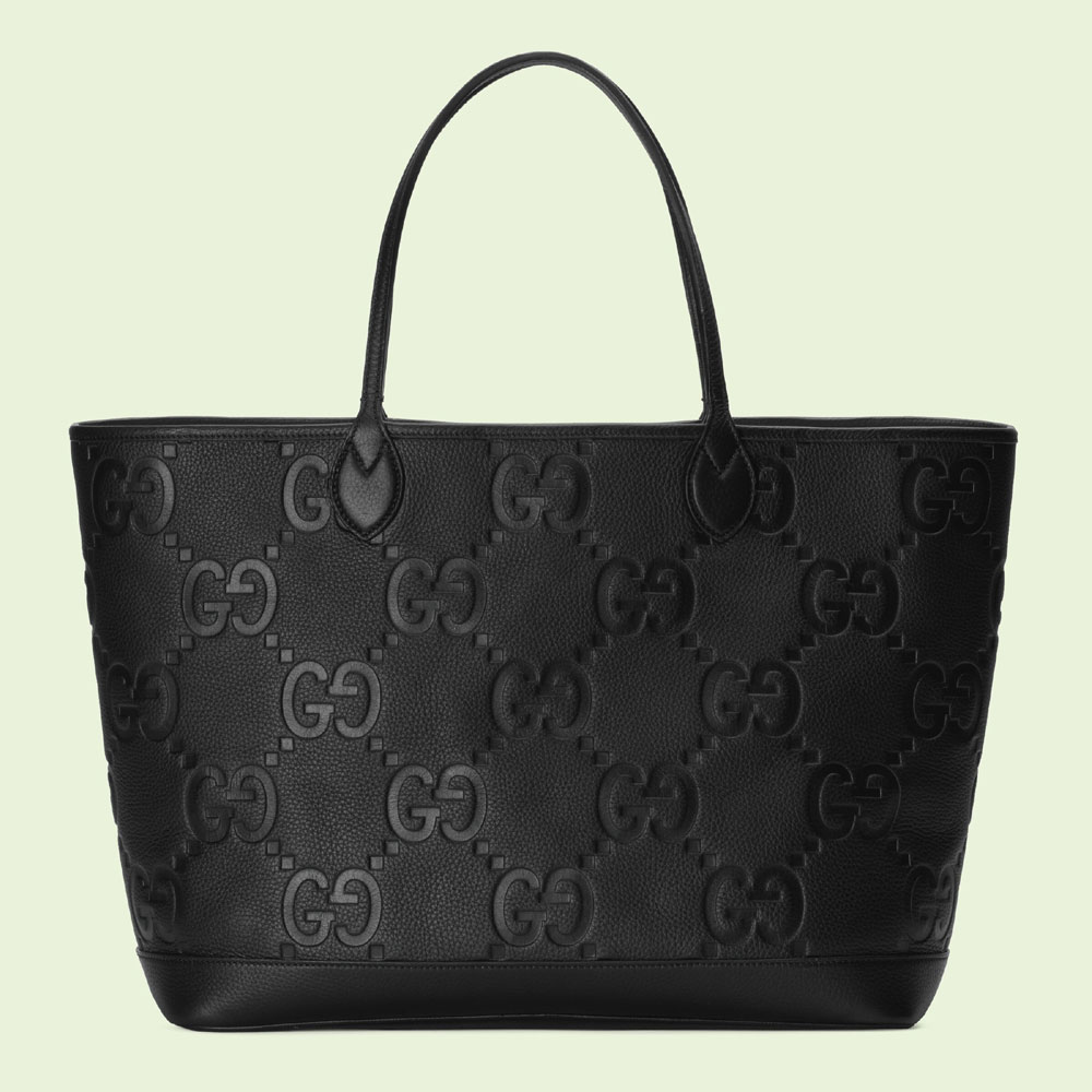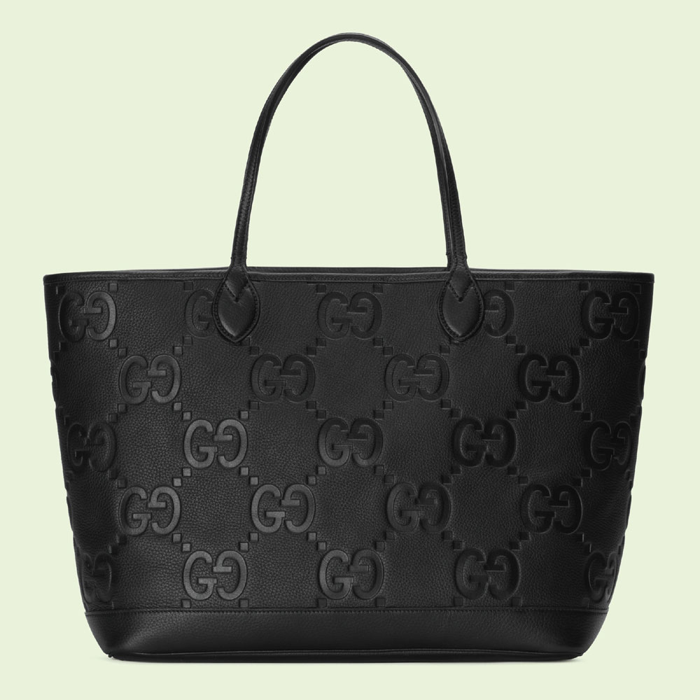 The all-black jumbo GG design returns for Pre-Fall 2023 atop a selection of leather pieces. A reinterpretation of Guccio Gucci's initials. the motif is an evergreen of the House that appears prominently in maxi size for an eye-catching logo feel. The signature motif decorates this large tote bag.