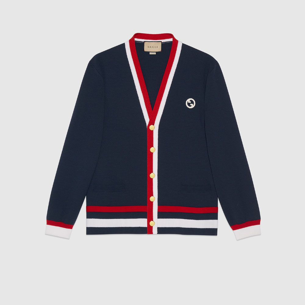 Classic knitwear is reimagined with refined details and emblematic House codes. Crafted from dark blue knit wool, this cardigan has a Round Interlocking G patch at the chest, giving a subtle logo touch to the design. A red and ivory stripe trim decorates the style.