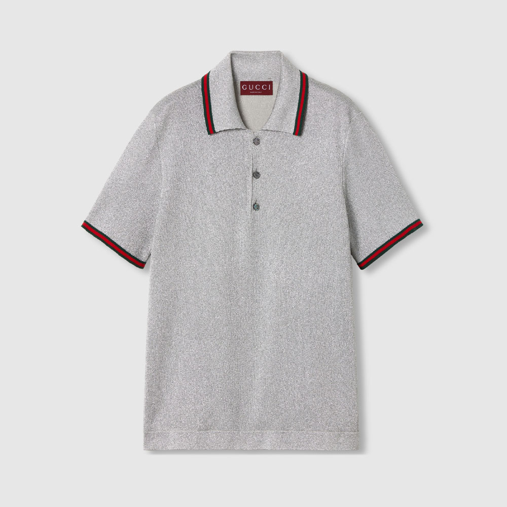 Gucci Lame Knit Polo Shirt in Silver effortlessly elevates modern menswear. Pair this statement piece with tailored black trousers for a polished evening look, or layer it under a structured navy blazer to highlight its metallic ribbed texture.