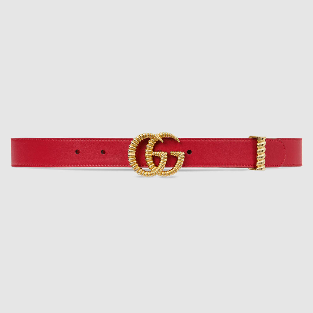 The Double G-an archival reprisal of the House's signature emblem-is introduced with a torchon design for Pre-Fall 2018. The twisted effect lends dimension to the leather belt. finished with a metal loop.