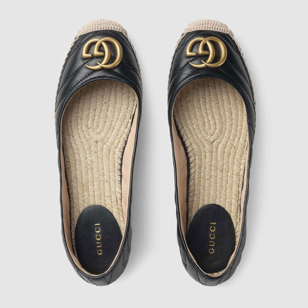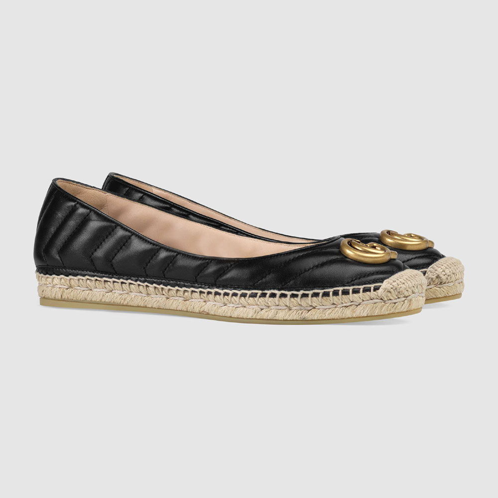 Made from soft matelass chevron black leather the espadrille has a ballet flat inspired shape with a rounded toe embellished with the Double G. The emblematic hardware has become synonymous with the GG Marmont line. Evolving from an archival belt from the 1970s.