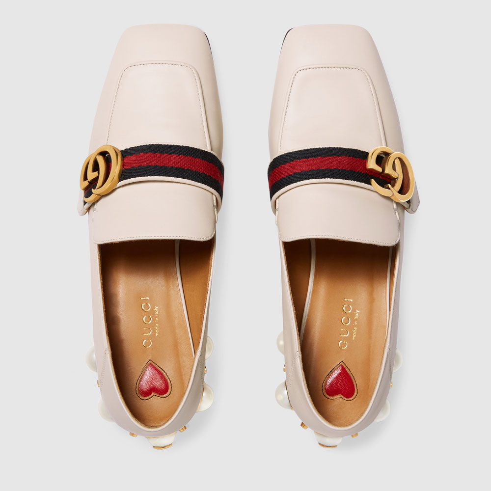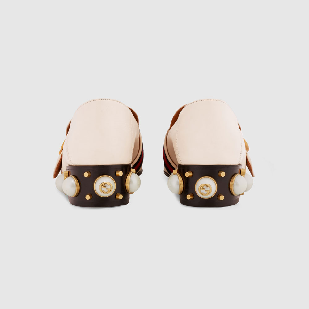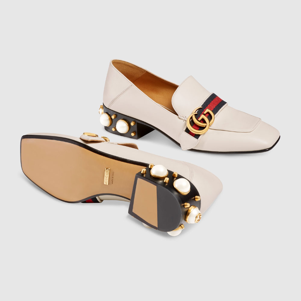 The Double G antique gold-toned hardware is set on a blue and red Web of these leather mid-heel loafers. The stacked heel has a row of GG pearls and studs and the back is designed to be worn with the heel folded down or up.