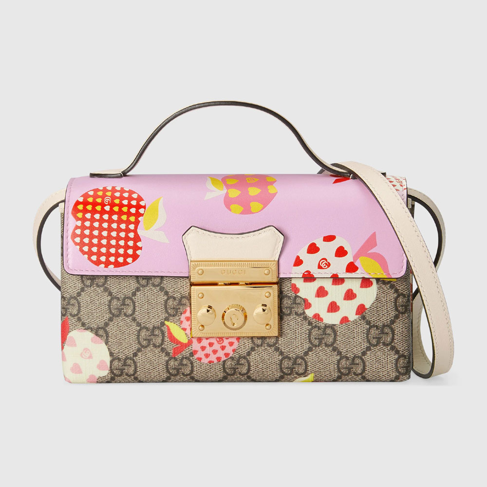 An emblem of the Gucci's playful spirit. fruits and vegetables have become contemporary House codes that animate the latest collections. Speaking to this theme. this mini Padlock shoulder bag is defined by a whimsical apple motif.