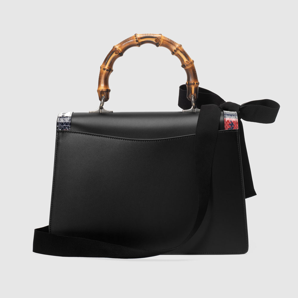 A leather top handle bag with printed snakeskin detail along the flap and Kingsnake head closure. The snake is often associated with the image of Lilith, who in mythology is thought to have been the first wife of Adam and later, a demon. The textured Kingsnake head has crystal stones set in the eyes. The bag is further enhanced with a bamboo top handle and black grosgrain bow detail. Made in smooth leather.