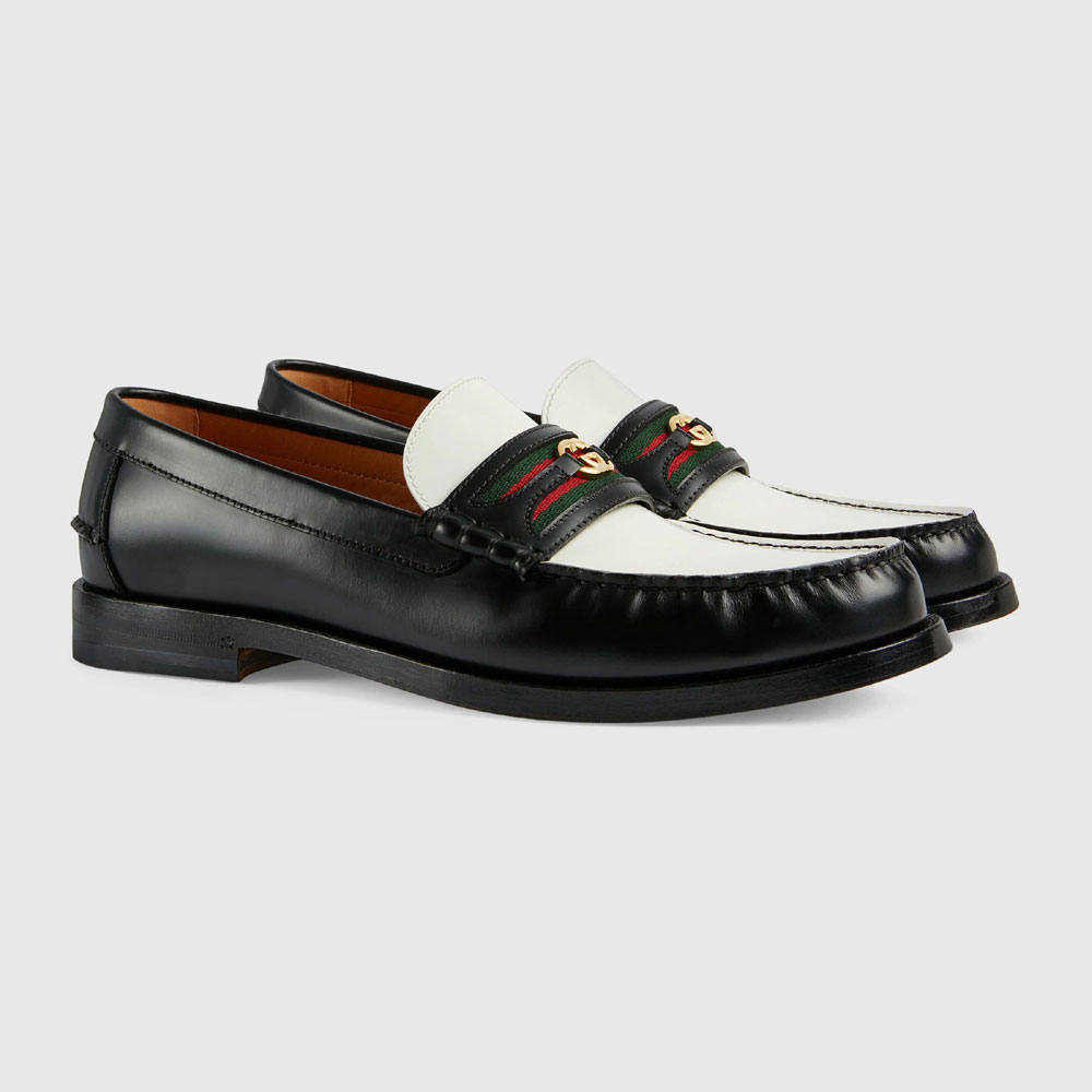 An emblematic Gucci silhouette. leather loafer is presented in contrasting shades of black and white. Inspired by the archives. the style is connected to the origins of the House through the gold-toned monogram hardware and the green and red Web stripea nod to the brand's equestrian roots.