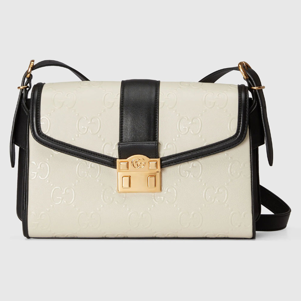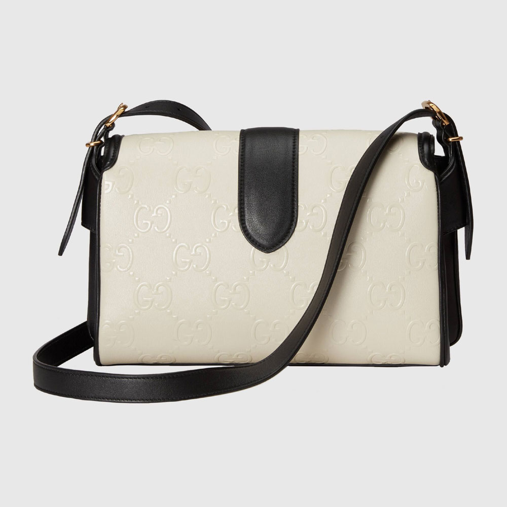 The GG motif is a subtle nod to the theme of reinvention that appears throughout the House's narrative. First used in the '70s. the monogram is an evolution of the Gucci Rhombi designa pattern from the '30s' archives. A part of The Gucci Aria collection. it appears as an allover motif across this black and white shoulder bag.