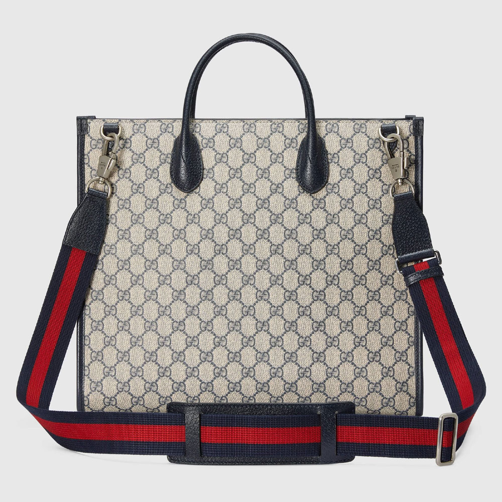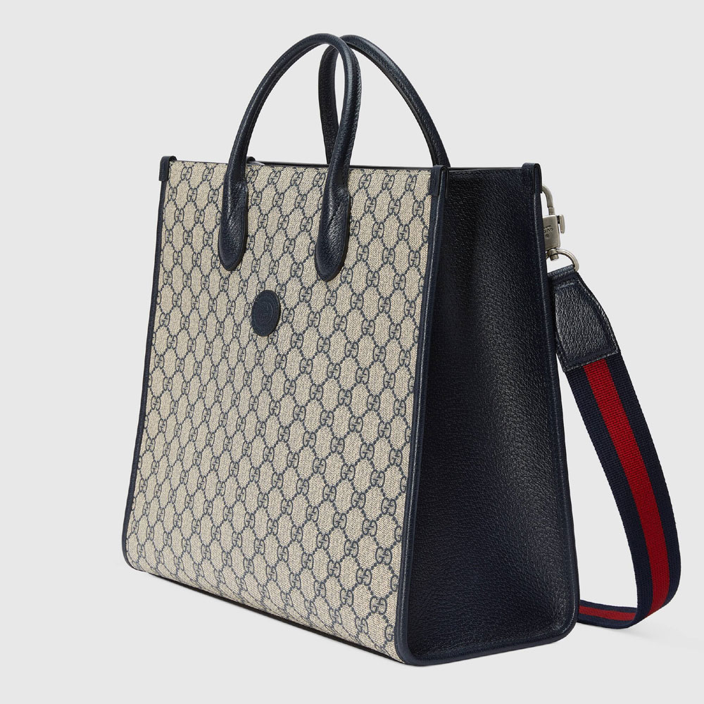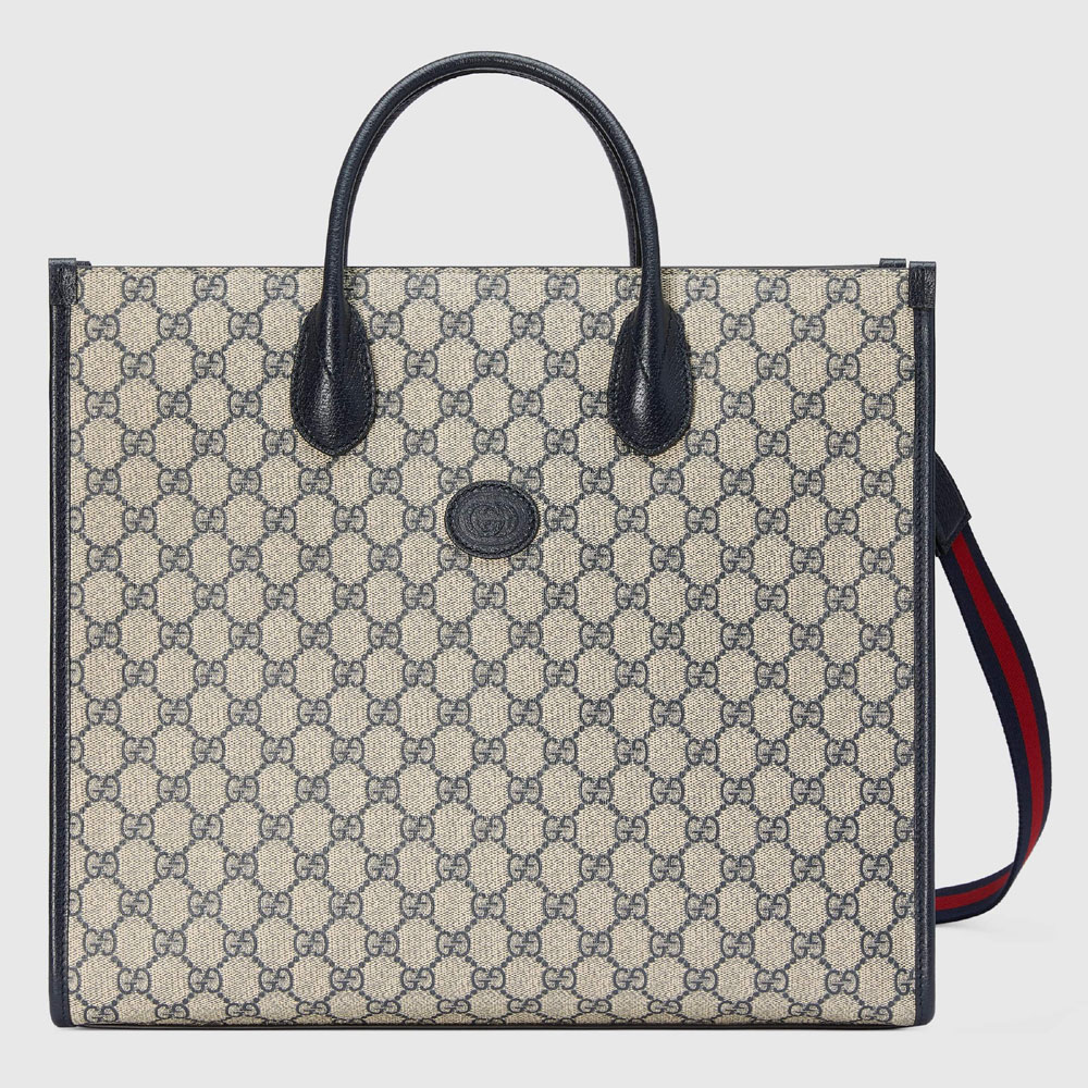 Mirroring the material's historic origins. GG Supreme is introduced in a timeless mix of blue and beige for Gucci Love Parade. With a low environmental impact. the canvas has come to the front of each collection decade after decade to become a hallmark of the House. Here. the classic palette defines this medium Interlocking G tote bag.