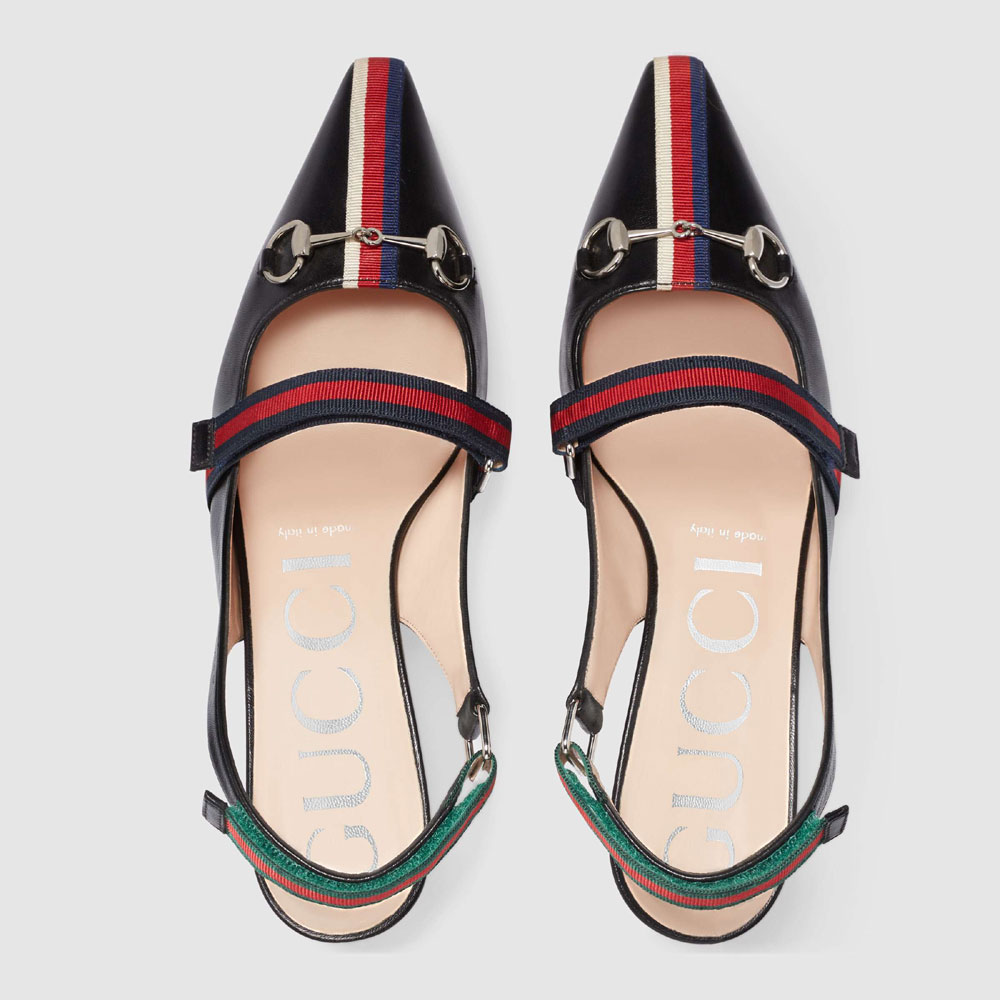 In a genre that has become so inherently Gucci. The mixing of sportswear-inspired elements and classic silhouettes is a distinctive theme throughout the collections. A playful mix of House codes. The traditional slingback in black leather is completed with grosgrain stripes featuring three versions of the House Web. Completed with the signature Horsebit detail.