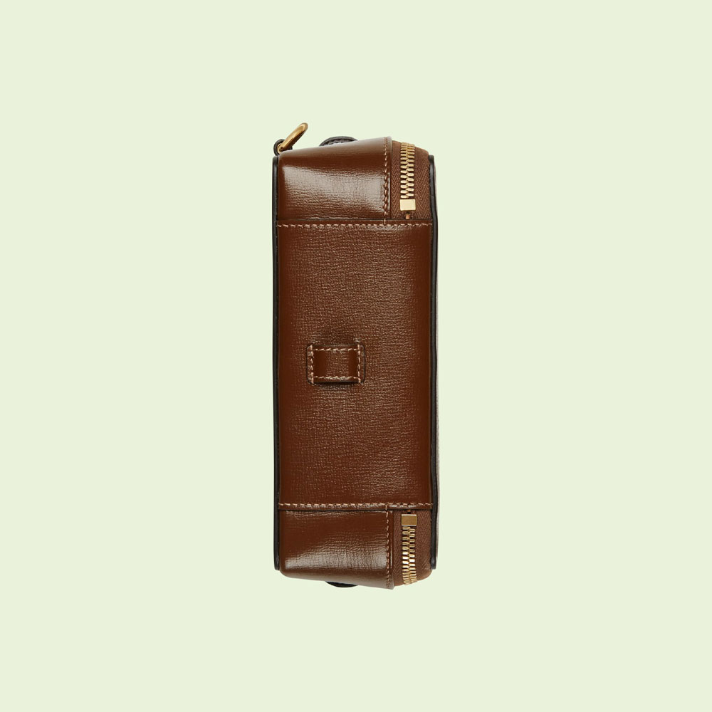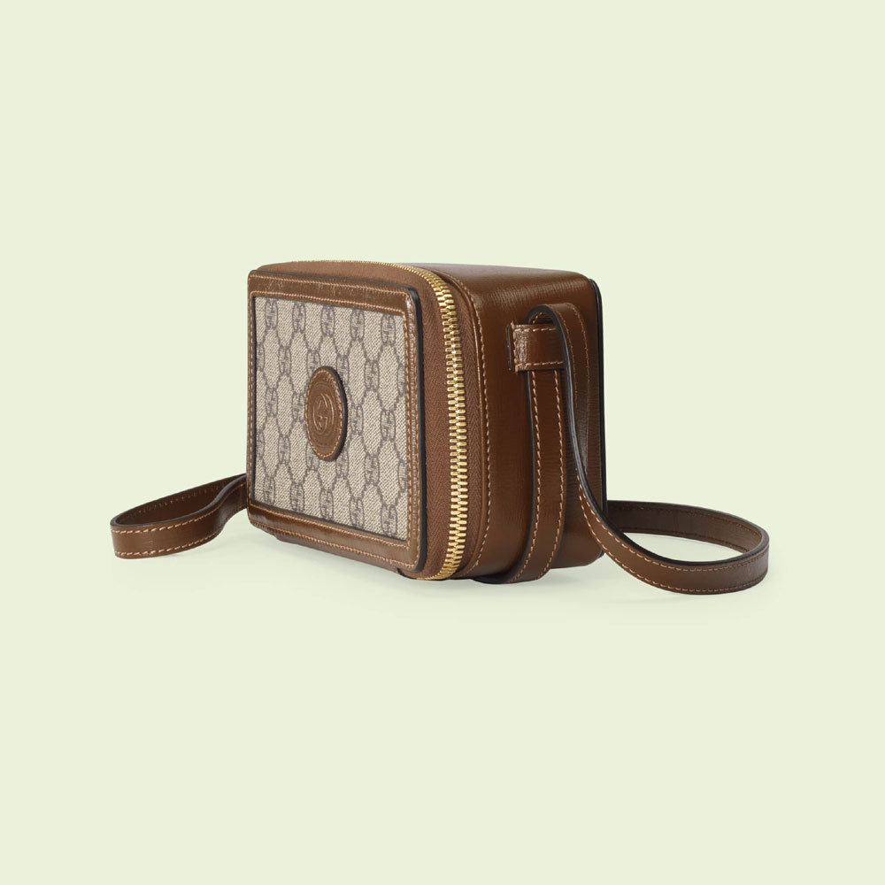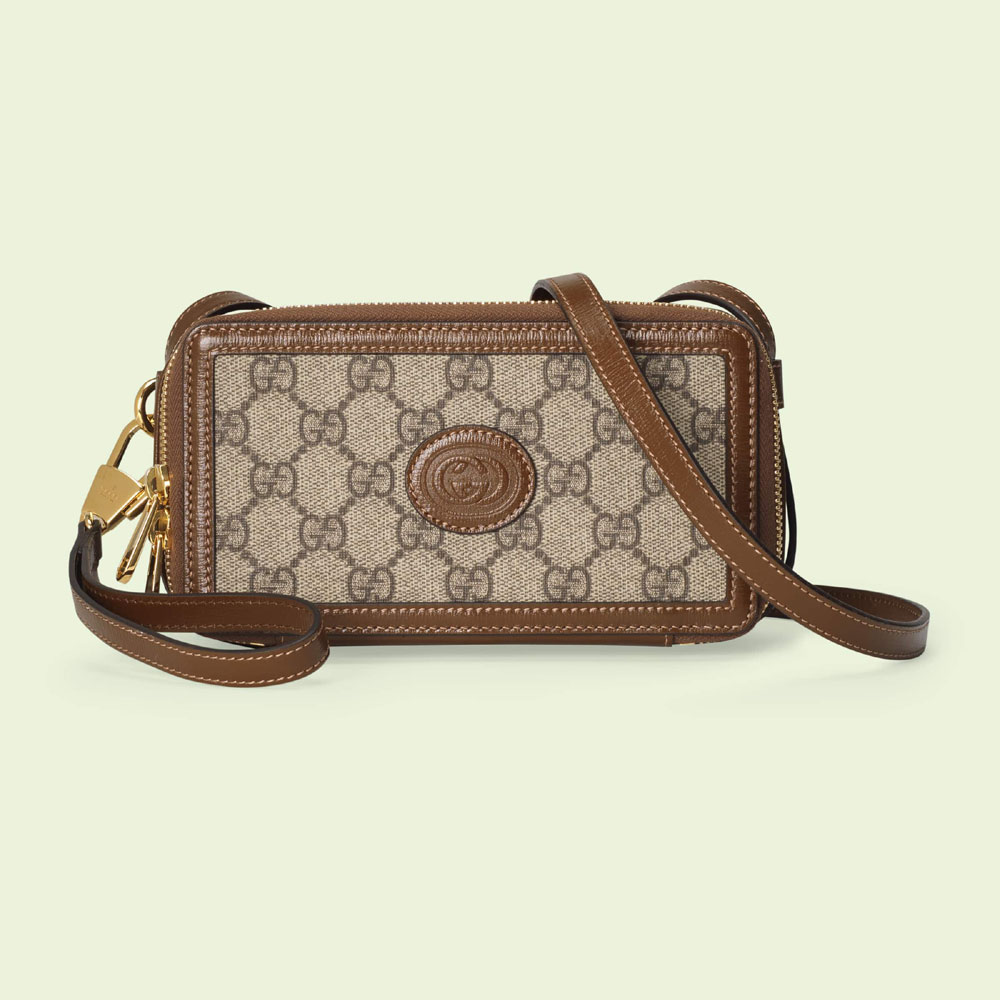 Archival fabrics and details combine to give a selection of accessories a vintage appeal throughout the Gucci Aria universe. Here. this mini bag is presented in GG Supreme canvas and enriched by a tonal leather trim and Interlocking G tag.