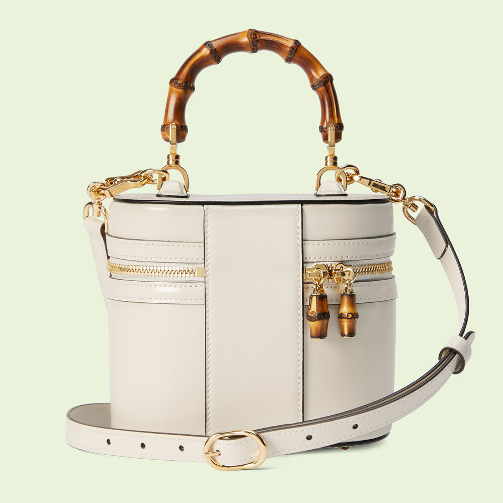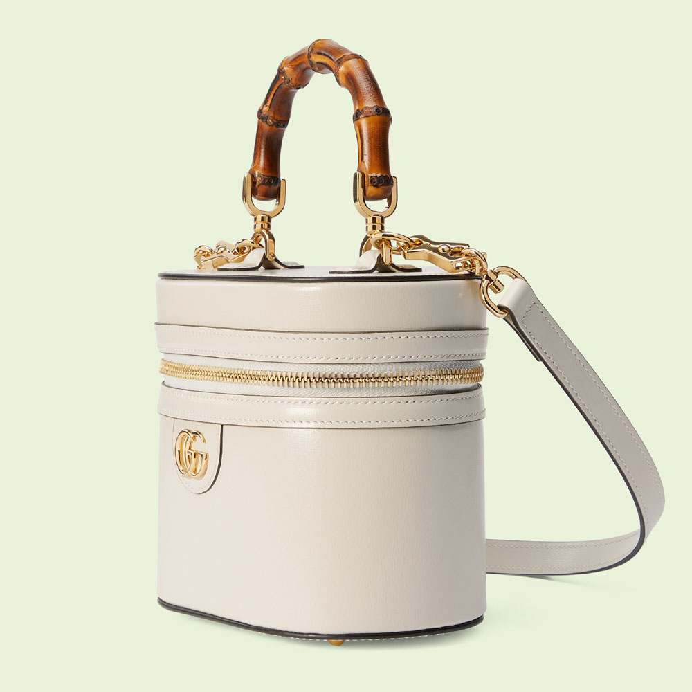 Combining recognizable elements of the House. this mini bag is defined by its bamboo handle and Double G hardware. Crafted from white leather. the accessory is completed by a detachable and adjustable shoulder strap.