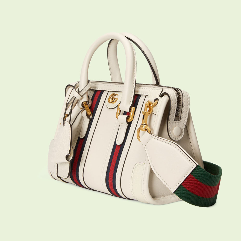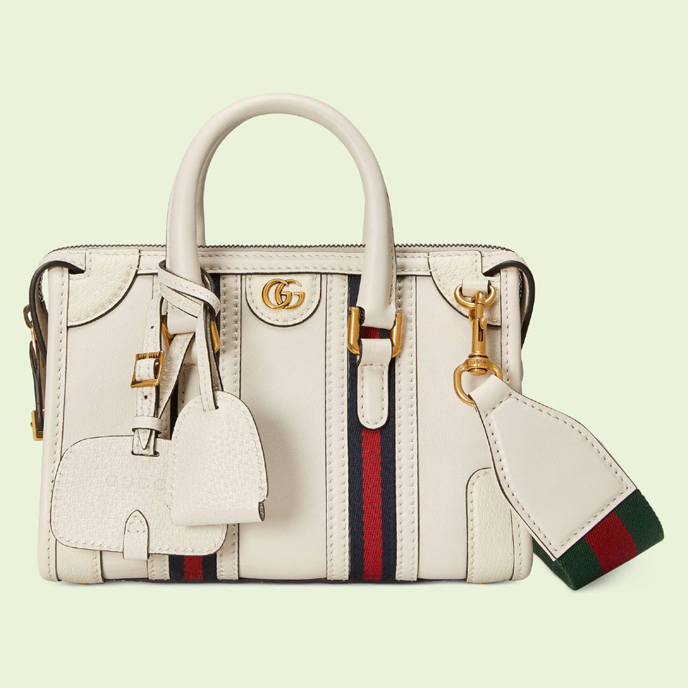 The top handle bag is reimagined in a new duffle style. part of the House's latest collection Exquisite Gucci. Crafted from smooth white leather. the Web stripe and Double G hardware characterize the silhouette with archival symbols of the House.