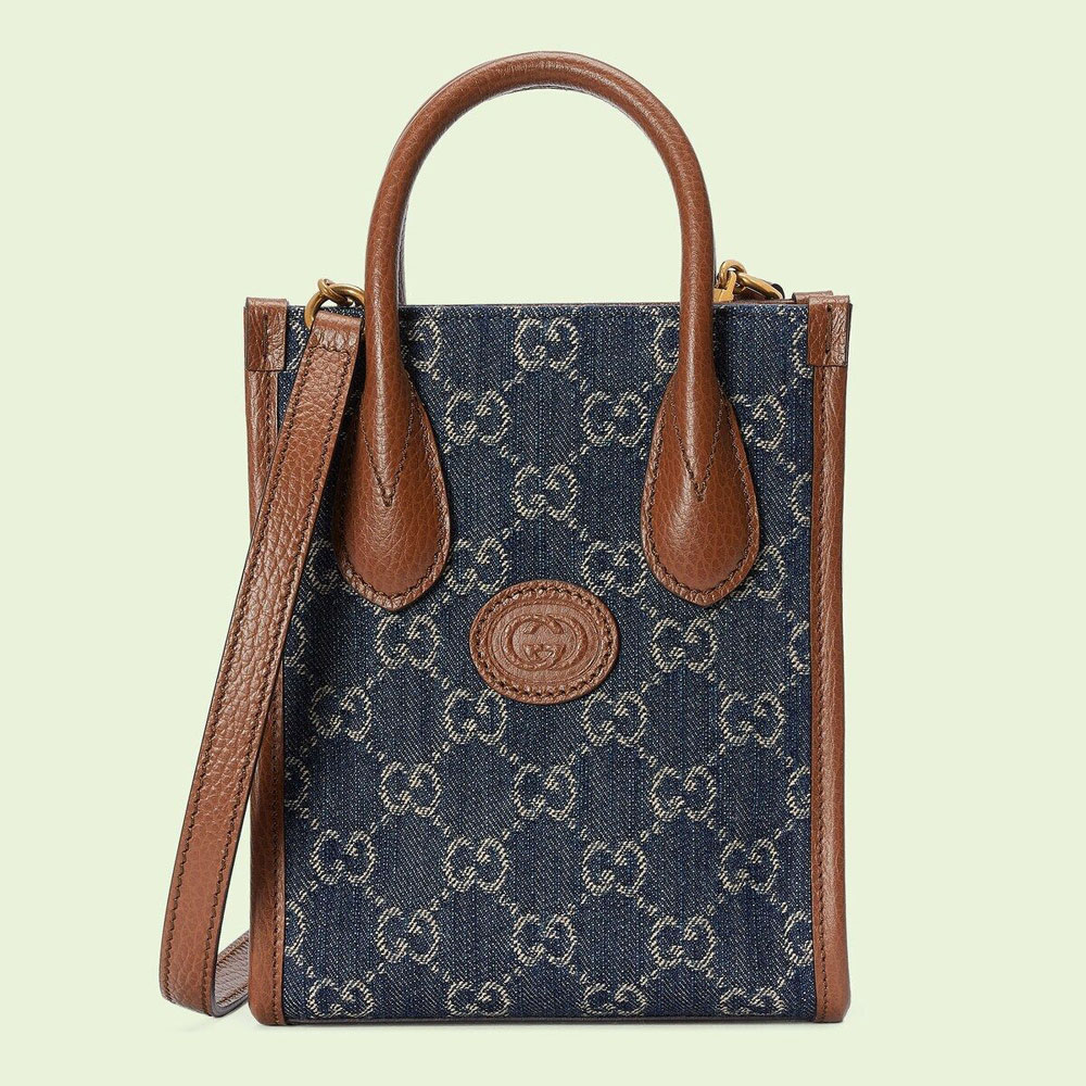 GG denim. a signature material seen both in the handbags and ready-to-wear selections. Here the unmistakable jacquard returns as part of the Gucci Love Parade collection. enriching classic luggage styles with the allover motif. A brown leather trim completes this mini tote bag.