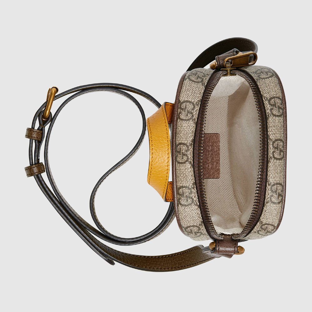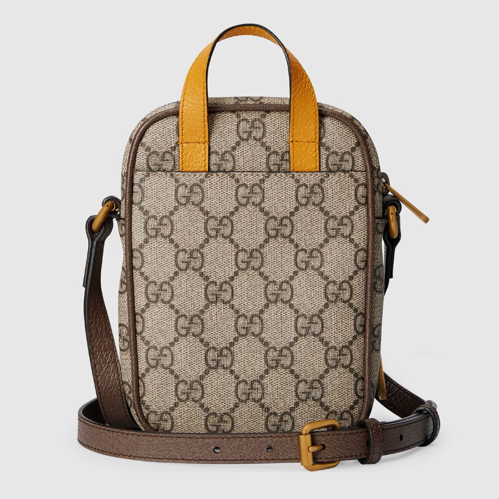 Beige and ebony GG Supreme canvas. A material with low environmental impact Brown and yellow leather details Cotton linen lining Oval Gucci leather tag with feline head 1 external pocket and 2 internal flap pocket with button closure Zipper closure 4.7"W x 6.3"H x 2.8"D Moire and microfiber lining with a suede-like finish