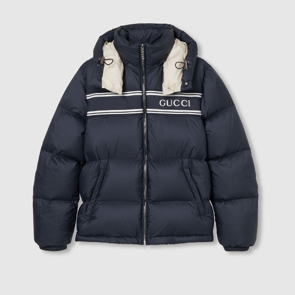 The Gucci logo appears in unexpected colors and fabric combinations in the Pre-Fall collection. This regular fit nylon puffer jacket has been crafted from a navy nylon and is enriched with a Gucci striped print across the chest. A Gucci zip puller further enriches the silhouette.