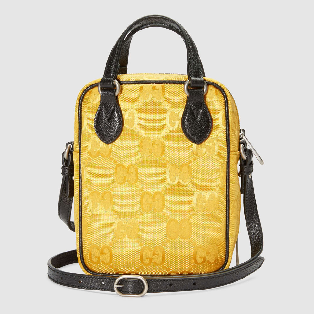 A line of accessories and ready-to-wear is presented for Pre-Fall 2020 made from recycled materials and trims. Supporting the Houses commitment to sustainability. Gucci Off The Grid is the first collection from Gucci Circular Lines a concept created to support the Houses vision for circular production. Designed for those mindful of their environmental impact. Gucci Off The Grid uses recycled. Organic. Bio-based and sustainably sourced materials. Regenerated nylon. Crafted using recycled sewing thread and trims displays the GG pattern against an opaque background in a vibrant orange hue. The shoulder bags rectangular shape is completed with two top handles and a shoulder strap.