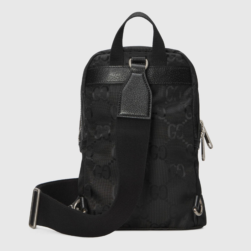 This sling backpack is made from recycled materials and trims. supporting the House's commitment to sustainability. Gucci Off The Grid is the first collection from Gucci Circular Linesa concept created to support the House's vision for circular production. Designed for those mindful of their environmental impact. Gucci Off The Grid uses recycled. organic. bio-based and sustainably sourced materials. Regenerated nylon. crafted using recycled sewing thread and trims. displays the GG pattern against an opaque background in a deep black.