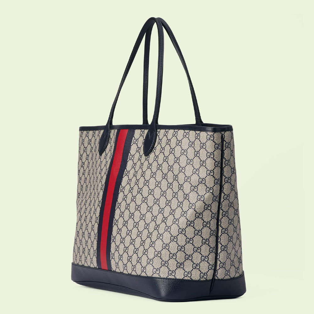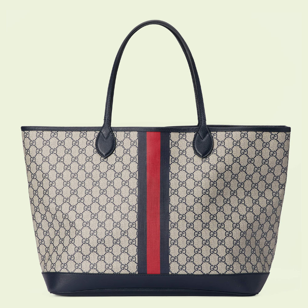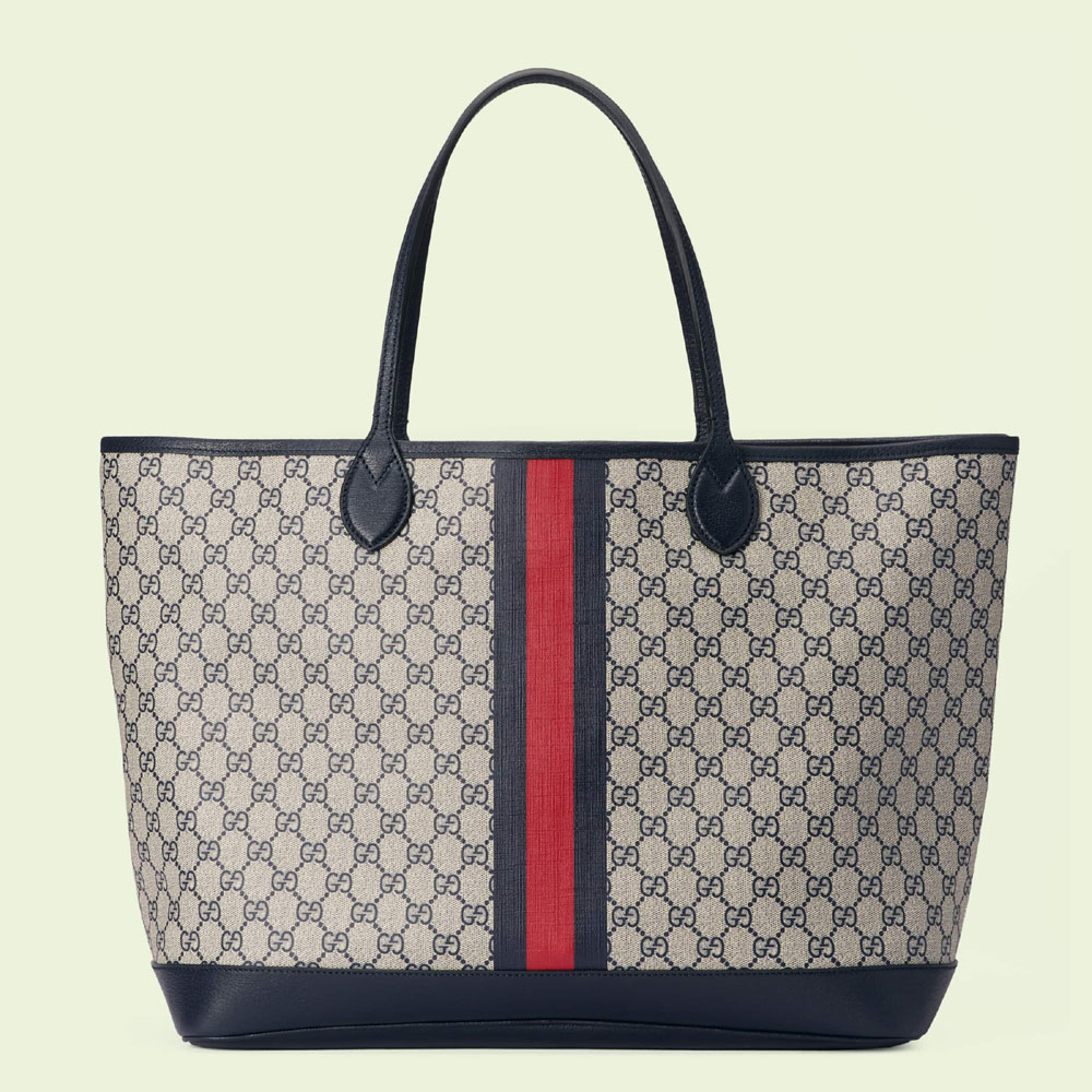 House collections continue the idea that pieces should be timeless and not just in fashion for one season. Guccio Gucci's everlasting monogram continues to enrich new designs with a logo feel. This Ophidia tote bag is presented in a beige and blue variation of the historical GG Supreme canvas. complete with the Web stripe.