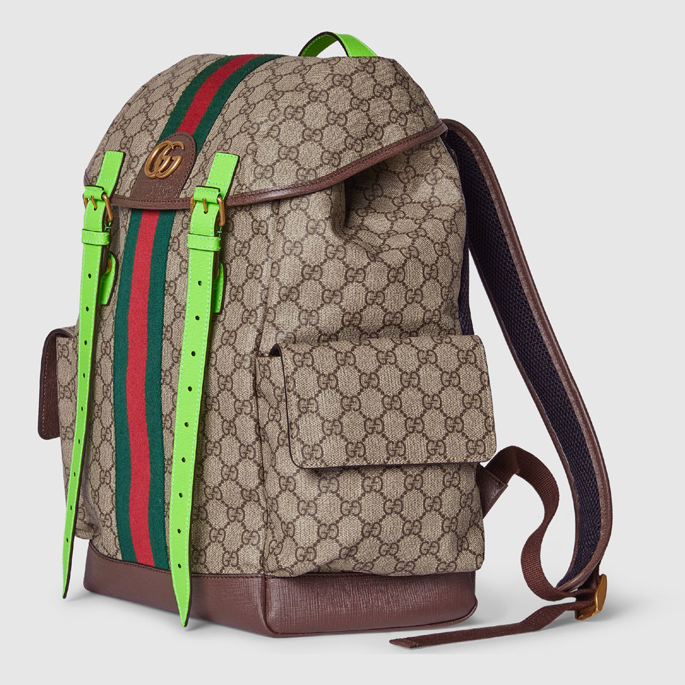 Reflecting the Creative Director's contemporary vision, the Ophidia lines come to life with a pop of fluorescent green. Combining the GG motif and Web stripe with a modern hue launches signature travel pieces into the metropolis, such as this backpack complete with side pockets.