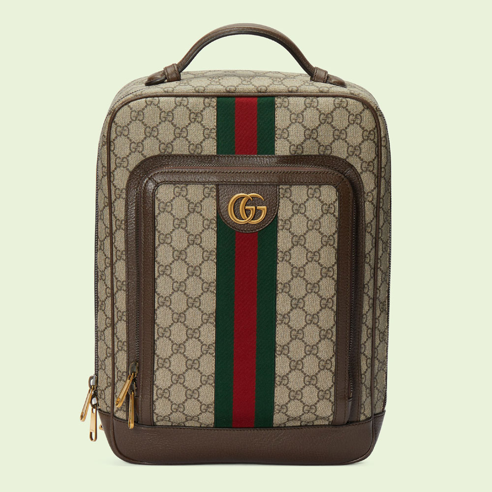 Gucci heritage meets contemporary design with the continuation of Ophidia. With its two archival details. the Web and the Double G hardware. the line takes on new shapes and dimensions in the Pre-Fall collection. Here the unmistakable design defines this medium backpack. complete with front zip pocket.