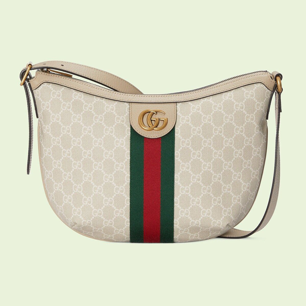 An archival design from the 1930s inspired the GG Supreme canvas. now one of the House's most emblematic materials. Traditionally presented in beige and ebony. it appears here in a beige and white combination. an ode to timeless pieces and everlasting design. An oatmeal leather trim completes this Ophidia shoulder bag. while the green and red Web detail adds a subtle reference to the House archives.