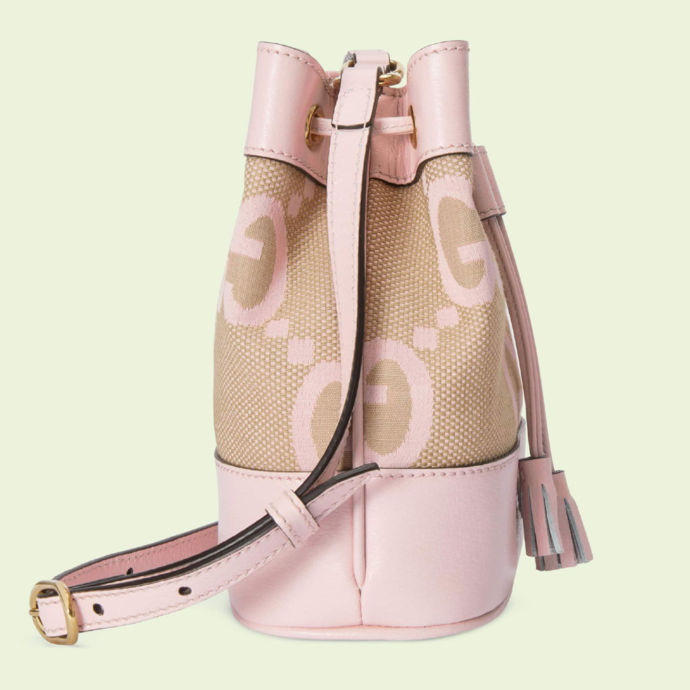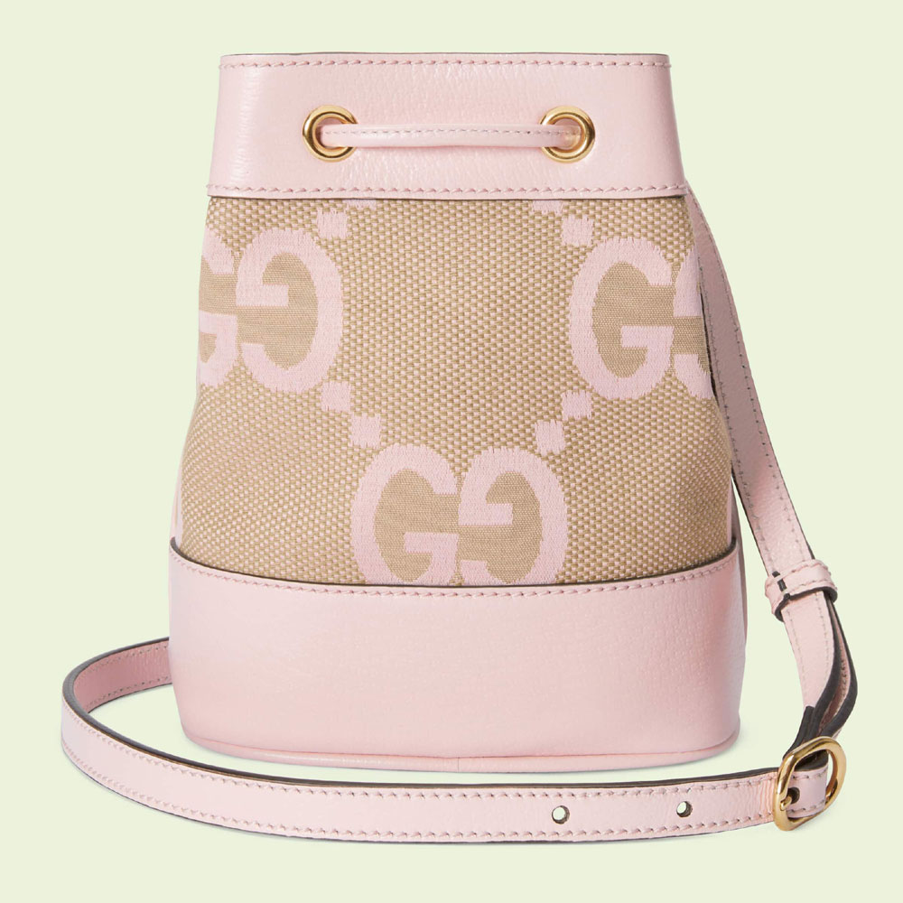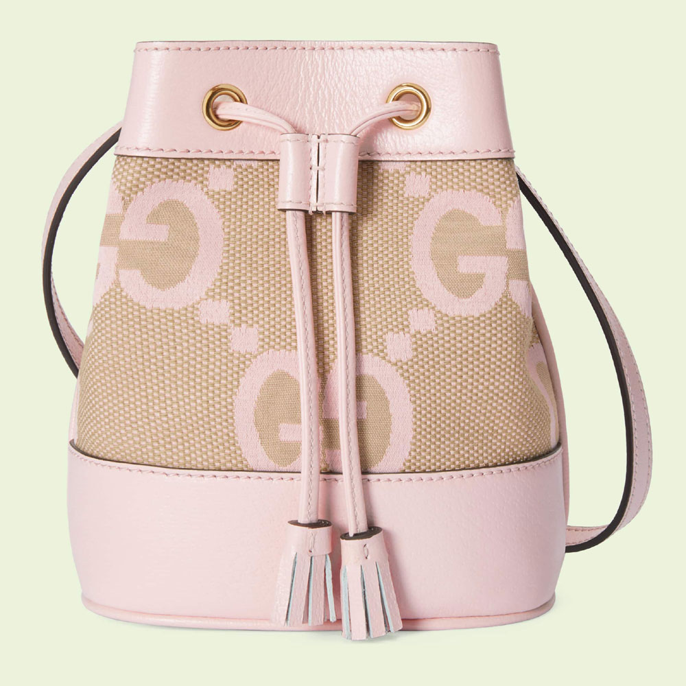 Mirroring the material's historic origins. this jumbo GG canvas is introduced in a timeless mix of light pink and camel. Over the decades. the canvas has come to the forefront of each and every collection. becoming a hallmark of the House. Here. the structured Ophidia bucket bag is trimmed with light pink leather and a tonal drawstring.