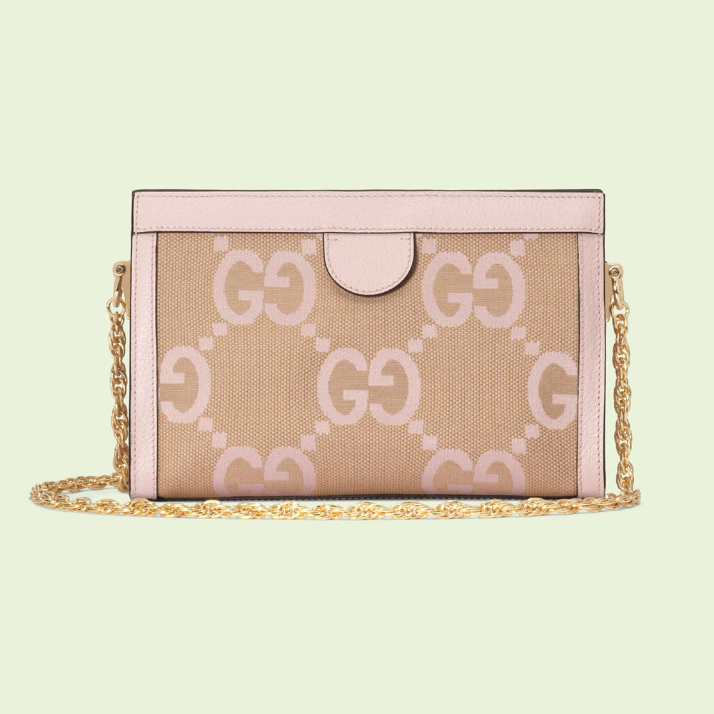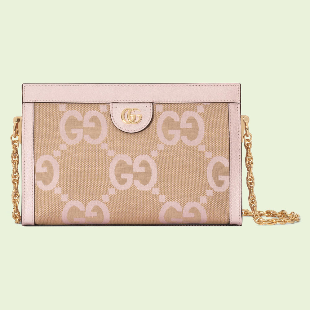 The Gucci color palette is constantly evolving to include more refined hues. New colorways and combinations result in the reinvention of signature styles with a contemporary feel. A jumbo GG canvas explores a new. maximalist version of the historic monogram. animating this small shoulder bag across a camel and light pink canvas base.