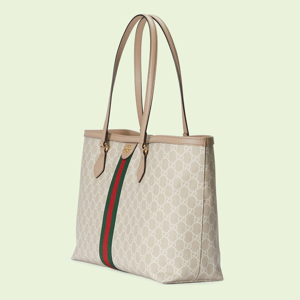 A heritage material from the archive. GG Supreme has been reimagined in Gucci Love Parade in different color combinations and combined with contemporary as well as classic styles. The Ophidia tote is presented in a beige and white variation of the signature material with a tonal trim. Originally a play on a '30s design. the canvas speaks to the historical narrative that runs throughout the collection.