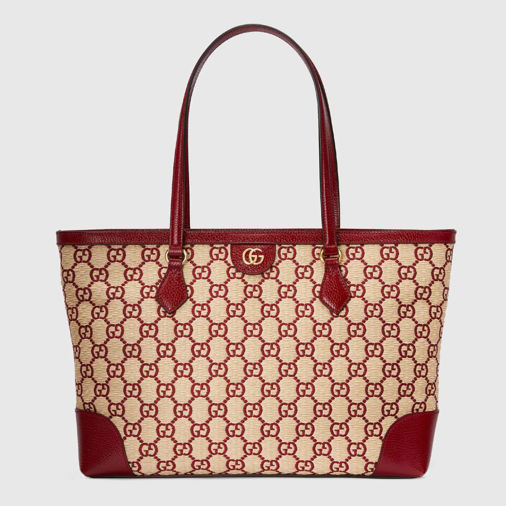 Whimsical materials appear in unexpected ways as a reference to the romantic narrative that runs through Gucci's designs. Combined with red leather. this tite bag is presented in a straw-like fabric with an intricate GG motif. The Ophidia line continues to play with archival elements. completing this design with gold-toned Double G hardware.