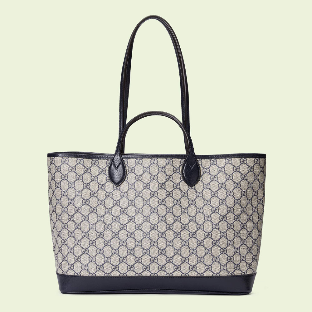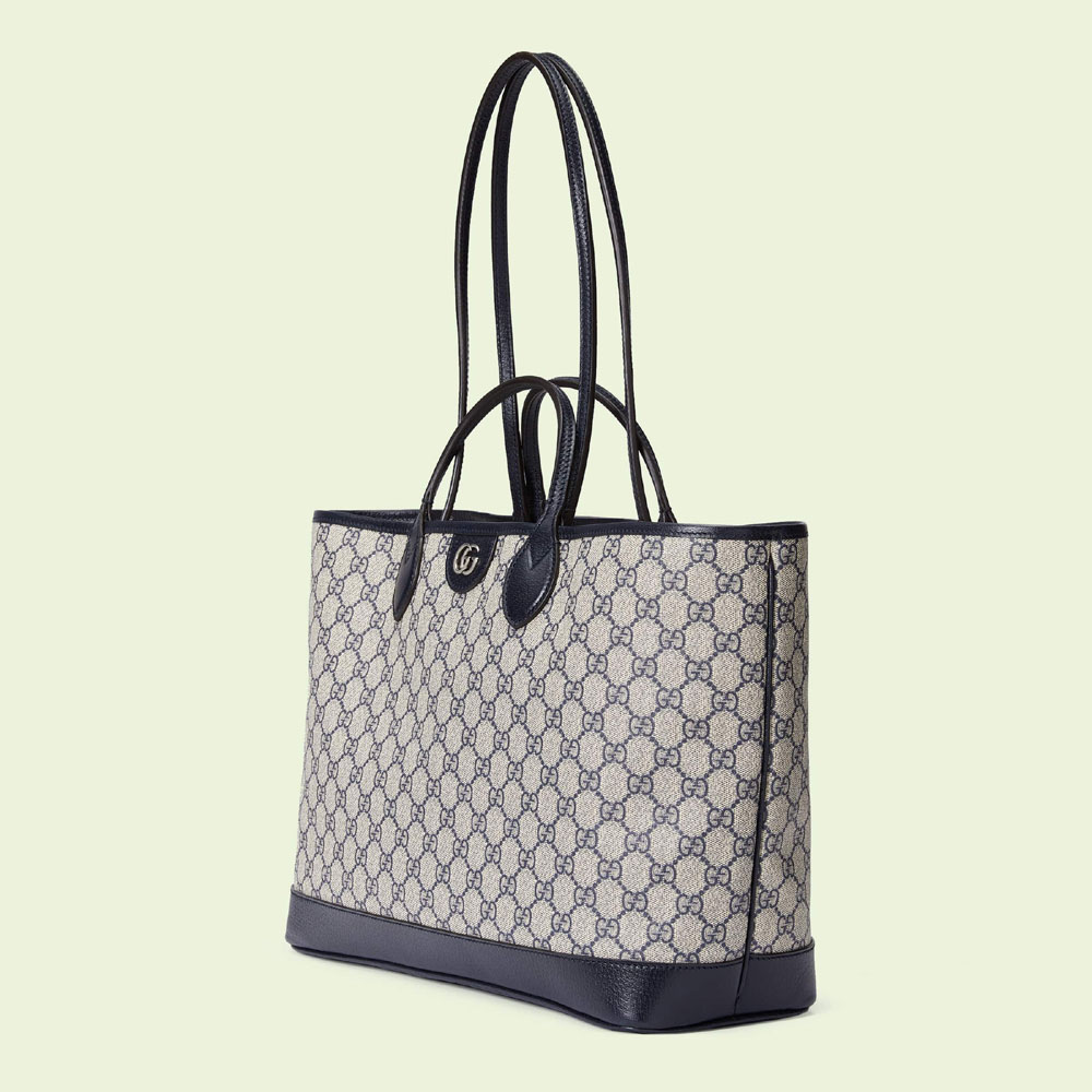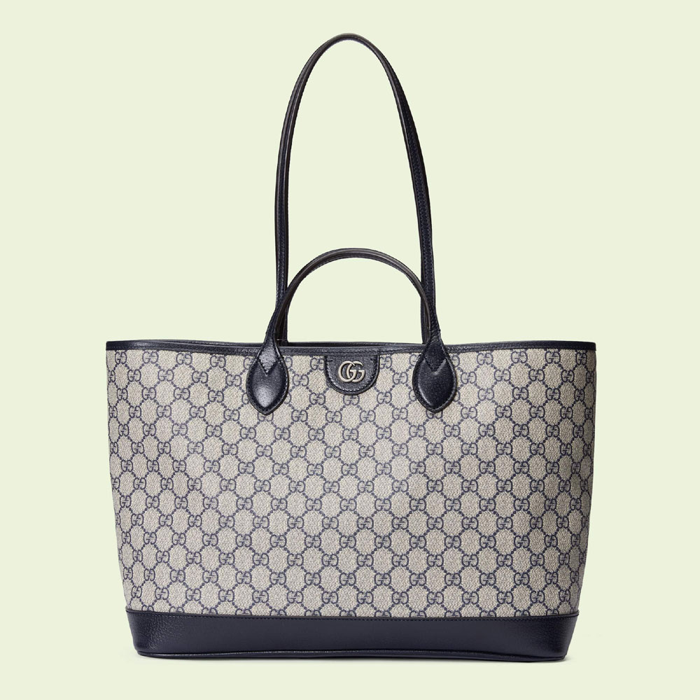 The Ophidia line continues to be one of Gucci signature handbags. New silhouettes are introduced each season. providing versatile accessories to complete any look. Two handles transform this tote bag. allowing it to be styled either as a shoulder bag or top handle. The Double G remains integral to the design. presented in GG Supreme canvas with a blue leather trim.