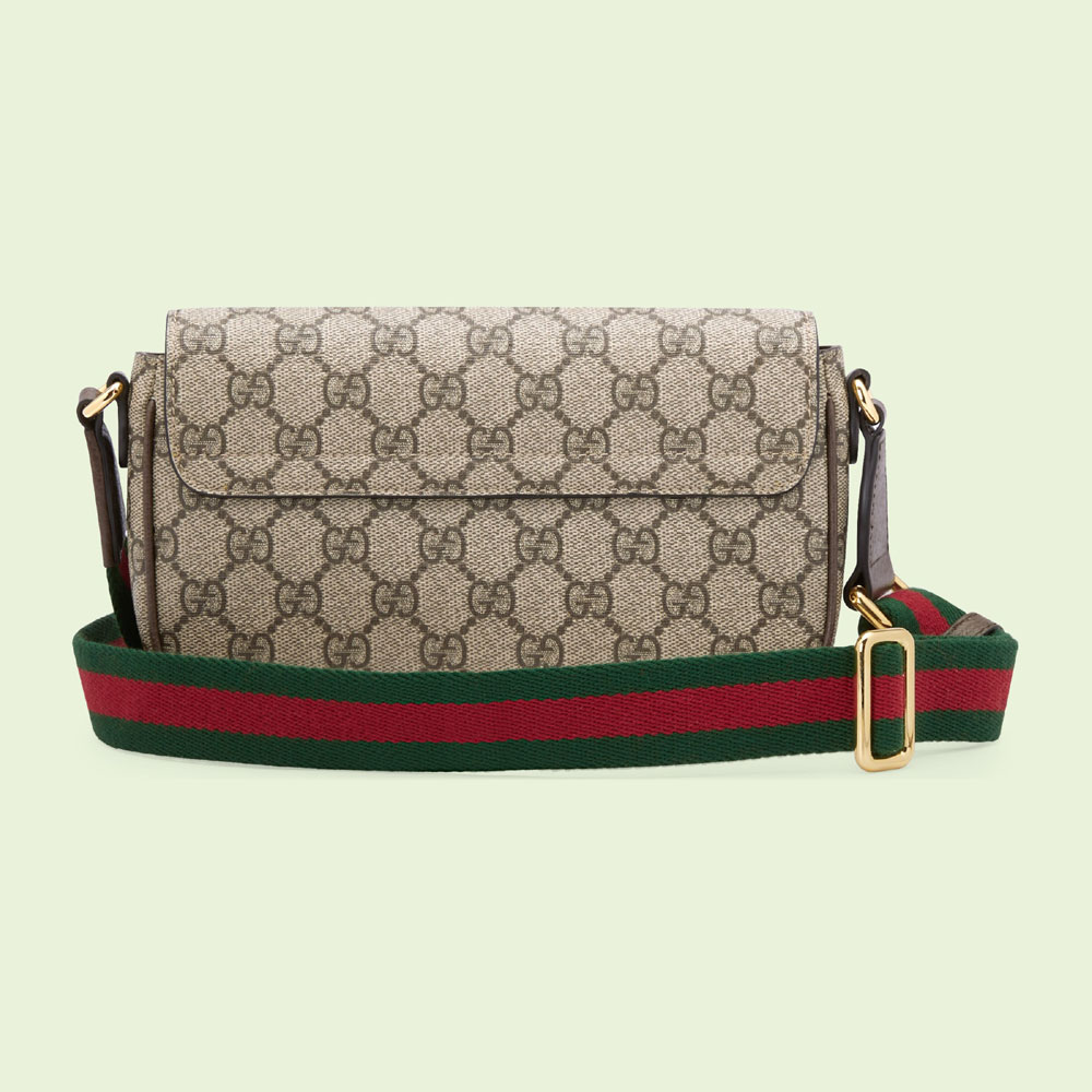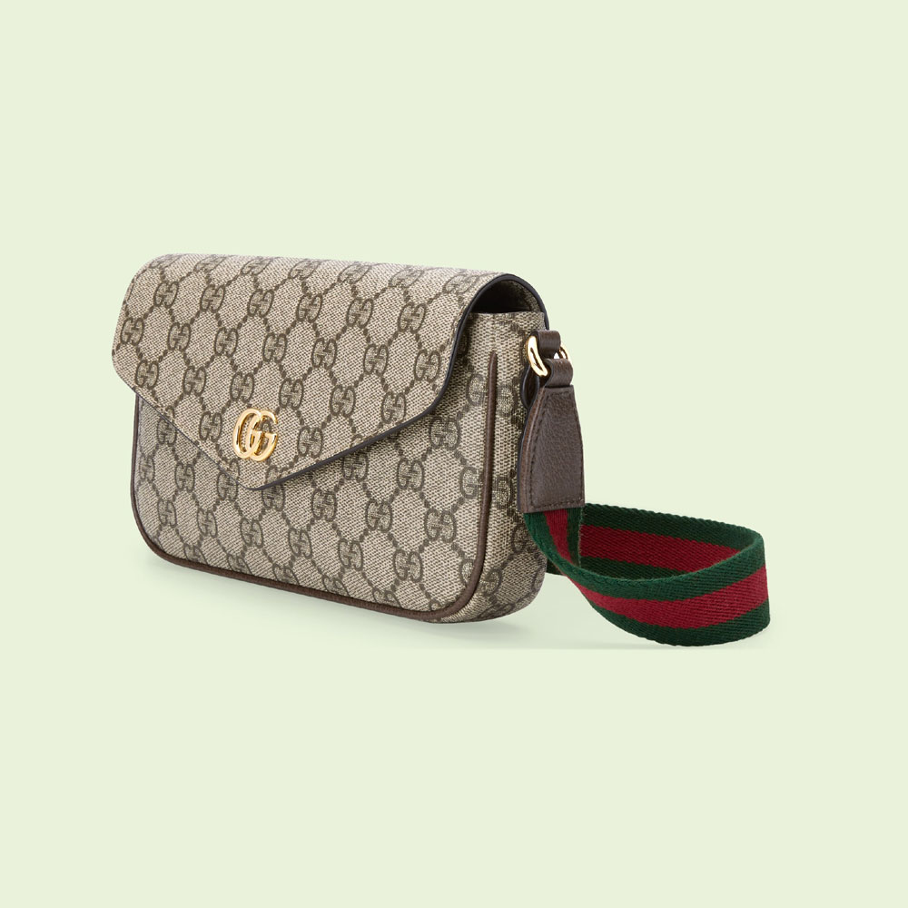 The world of Ophidia continues to evolve. incorporating new shapes and materials each season. Crafted from beige and ebony GG Supreme canvas. this mini bag is further enriched by the Double G hardware and a Web shoulder strap.