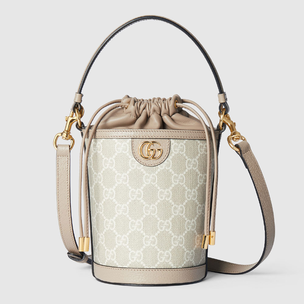 The Ophidia line is further elevated through new sizes and styles including variations with top handles as well as shoulder straps, allowing for versatile wear. The signature Double G hardware completes this mini bucket bag in a light gold against a beige and white GG Supreme canvas base.