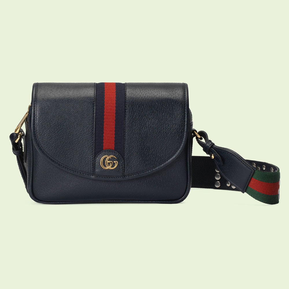 The Ophidia is reinvented in new and unexpected ways. Reminiscent of the punk scene. metal eyelets and studs define the historical silhouette to create a one-of-a-kind take on the archival style. Creating a playful contrast. the mini-sized shoulder bag is crafted from blue leather.