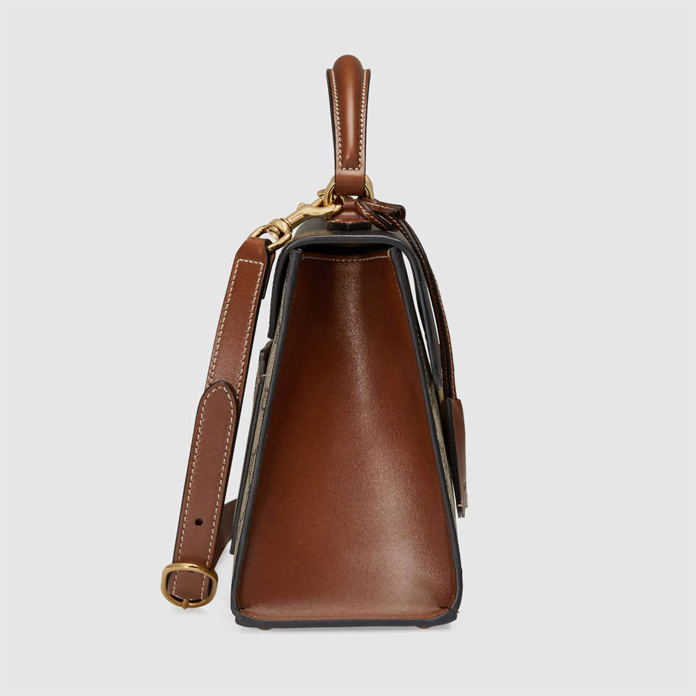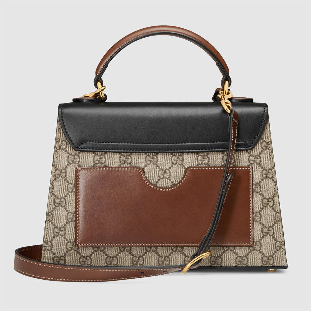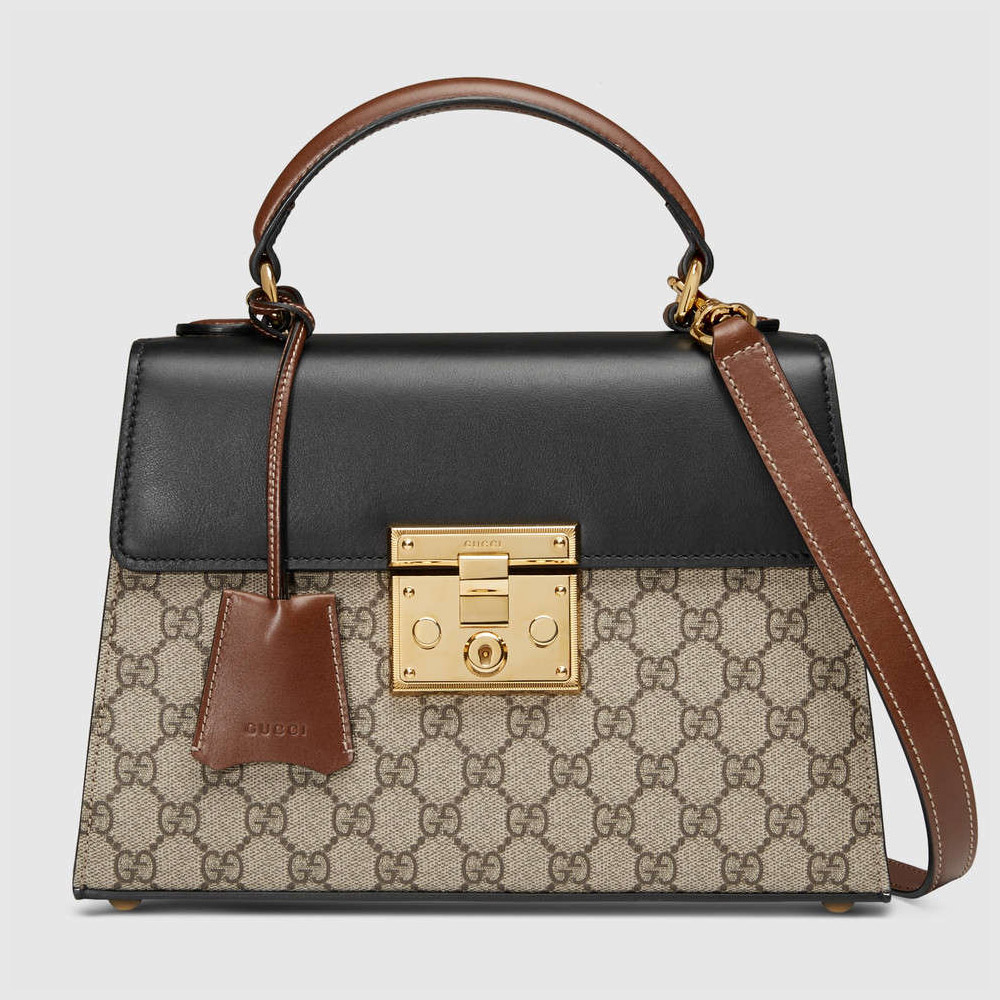 Beige/ebony GG Supreme canvas, a material with low environmental impact, with black and brown leather detail Gold toned hardware Interior zip and smartphone pockets Exterior back pocket, one side gusset Top handle with 3" drop Detachable shoulder strap with 22" drop attached to the handle Lock closure Small size: 11"W x 7.5"Hx 4.5"D Microfiber lining with a suede-like finish