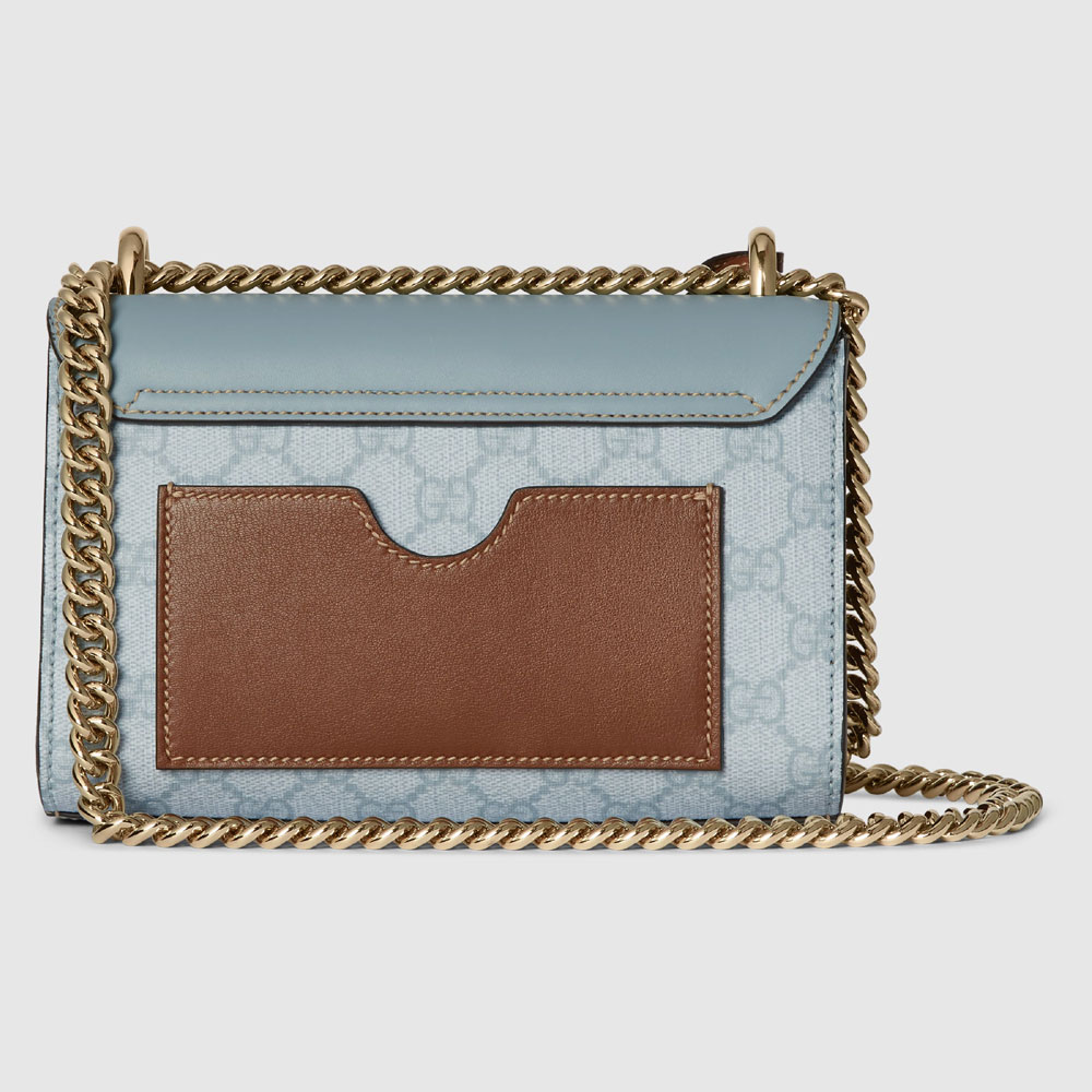 Drawing from the House's origins as an artisanal luggage atelier, the Padlock closure features prominently on this small shoulder bag in dusty blue GG Supreme canvas, with a dark brown leather back pocket and key holder. It is complete with light gold-toned hardware, smooth leather flap, and chain strap.