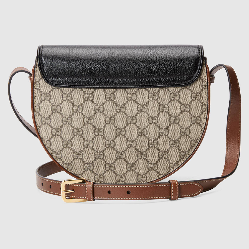 The Padlock family is enriched with the introduction of a crescent shaped shoulder bag. Crafted from the House's monogram canvas. Beige and ebony GG Supreme canvas. A material with low environmental impact Brown and black leather details Shiny gold-toned hardware Microfiber lining with suede-like finish Internal: 1 zip pocket and 1 open pocket Lock closure Small size: 8.6"W x 7.7"H x 2.6"D