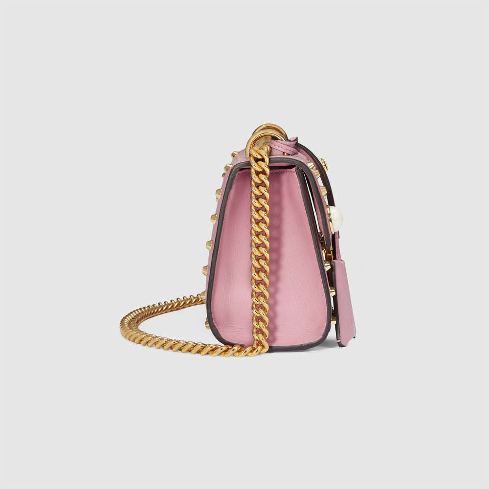 Pink leather Gold toned studs and glass GG Pearl studs Key with leather holder Interior open pocket One side gusset Sliding chain strap can be worn as a shoulder strap with 20" drop or can be worn as a top handle with 11" drop Lock closure Small size: 8"W x 5"H x 3"D